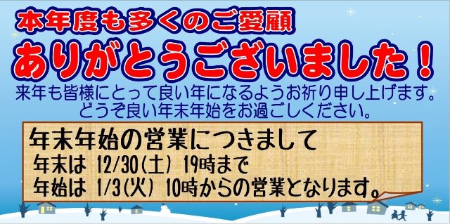 年末のご挨拶 ポスト 2016年12月30日 平素は格別のご愛顧を賜り厚く御礼申し上げます。本年も数多くのお客様にご来店いただき、ありがとうございました。2017年もタイヤ館加古川店を宜しくお願い致します。☆新年は1月3日(火)朝10時より通常通り営業いたします☆