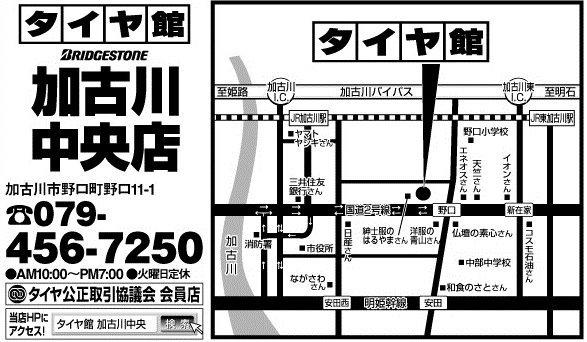 タイヤ館加古川中央店の地図も御一緒にご覧下さい。