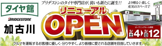 タイヤ館加古川店の『リニューアル オープンセール』の詳細はこちら。