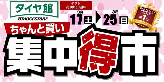 集中得市!今日から開催! ポスト 2018年3月17日 いよいよ始まりました! タイヤ館 加古川の ☆集中得市☆!! 期間は3月25日(日)まで! 春のお出かけに向けて タイヤや、お車のメンテナンスをご検討の方! 大チャンスですよ! さらに、 来年に向けてスタッドレスタイヤをご検討の方! お得にゲットするチャンスです! 他にも話題の『ドライブレコーダー』もあります! タイヤ館加古川の☆集中得市☆を ぜひご利用下さいね! タイヤ館のチラシはコチラ