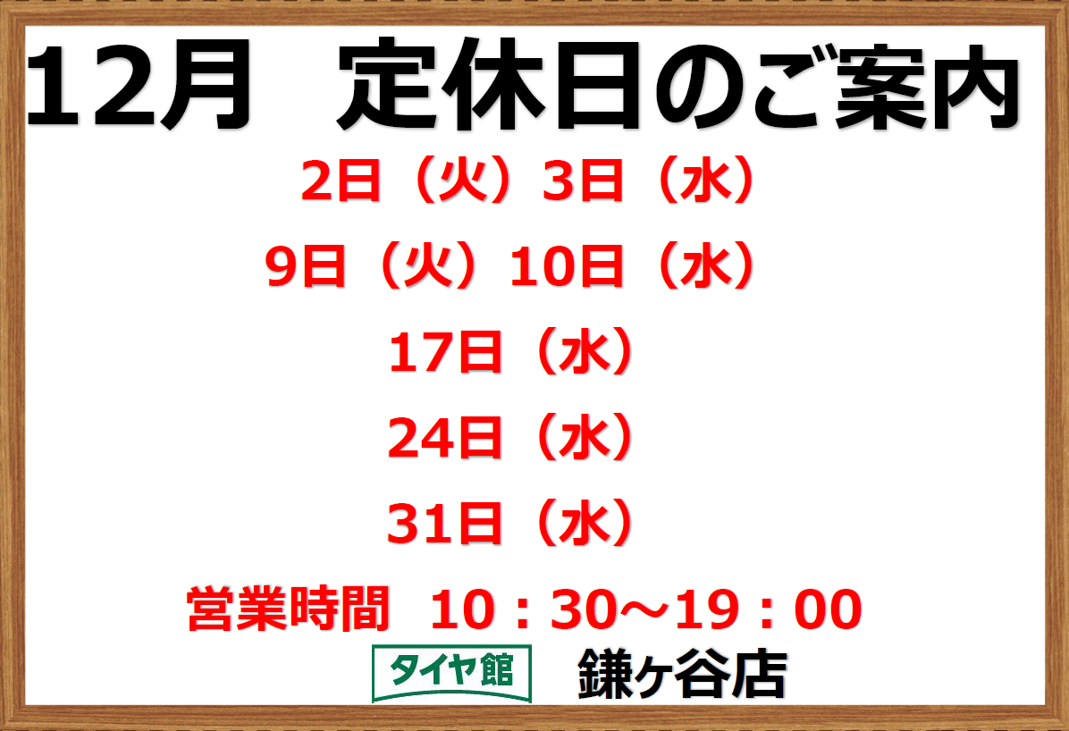 2025年12月 定休日のお知らせ 2025年11月27日 いつもタイヤ館鎌ヶ谷店のホームページをご覧いただきありがとうございます。 2025年12月 定休日のお知らせです。 ご利用のお客様はお間違えのないようお気をつけ下さい。 ご迷惑をおかけ致しますが、ご理解の程宜しくお願い致します。