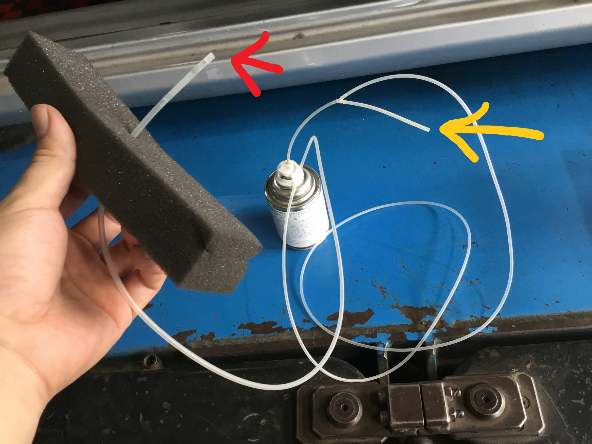 次にスプレー缶から伸びる赤矢印の長いホースをスポンジに刺します!