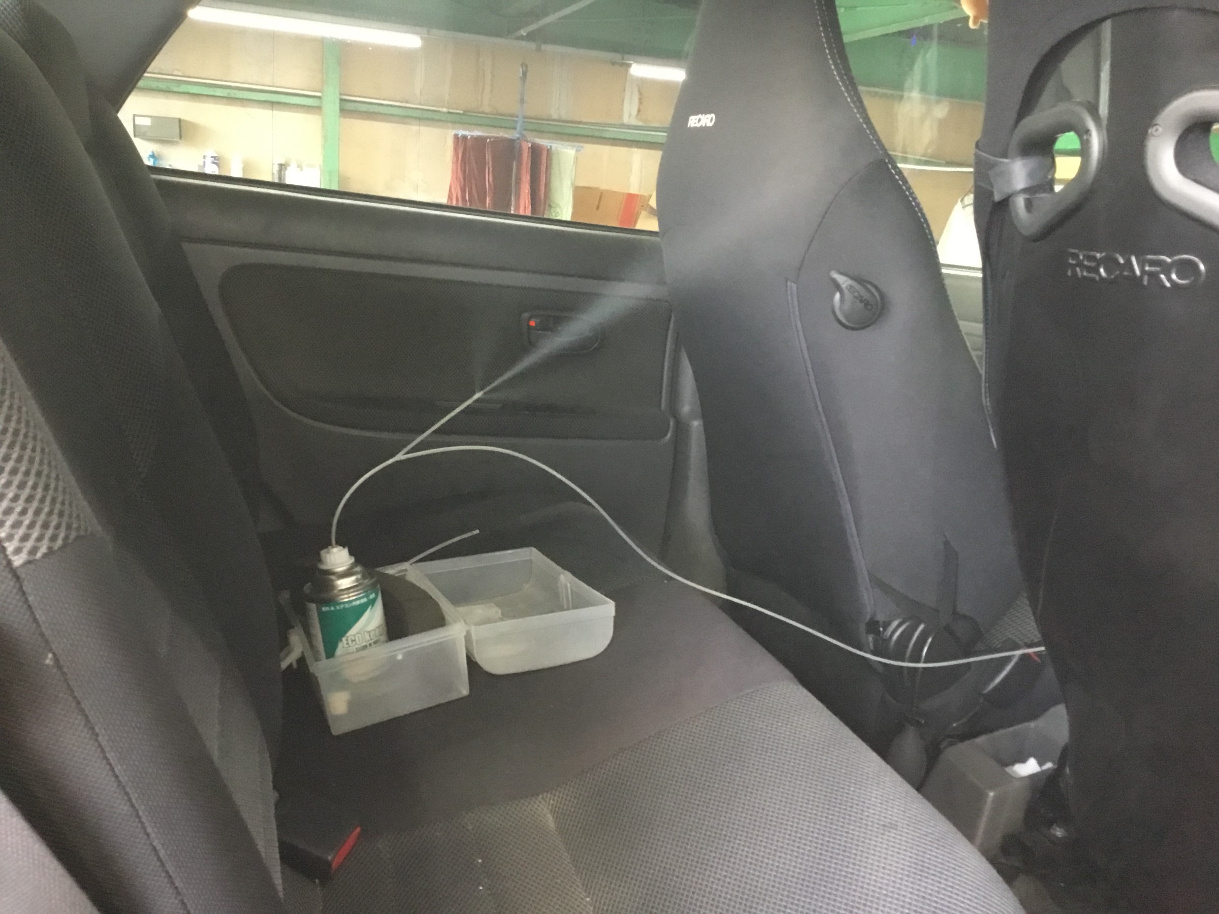 あとはスプレー缶を車の真ん中~後ろに置いて、窓を閉めてエアコンを内部循環で風量全開で作動させつつミストを噴射!ヽ(゚∀゚)メ(゚∀゚)ノ ブッシャー!!