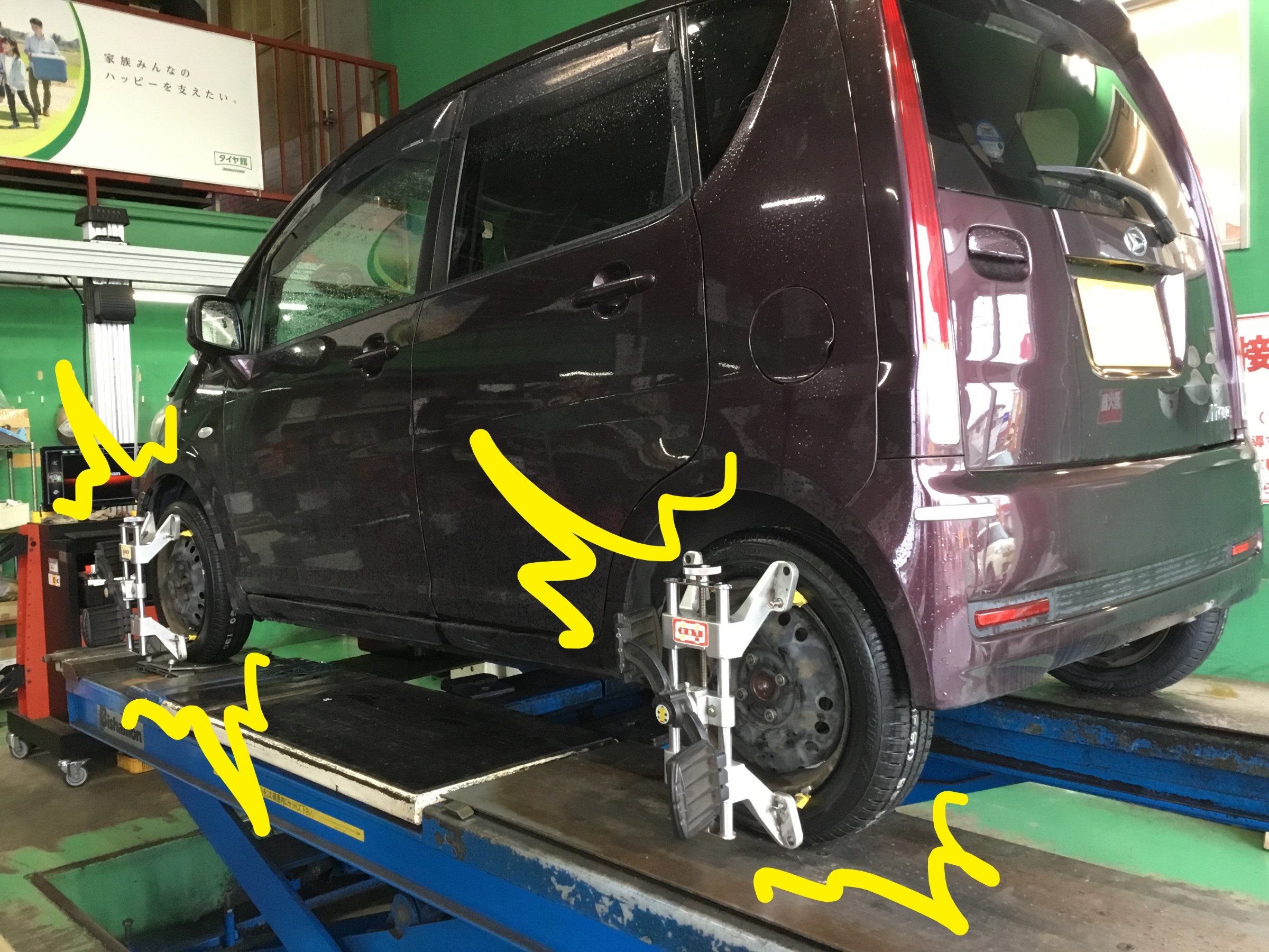 人間でいう“内股”や“ガニ股”のようにタイヤの角度もズレが生じてくるので、そのままにしておくとタイヤの性能を発揮できなかったり偏摩耗に繋がったりするのでこちらのムーヴのようにタイヤ交換と同時に修正してあげるのがオススメです!( ,,`・ ω´・)車の整体ですね♪