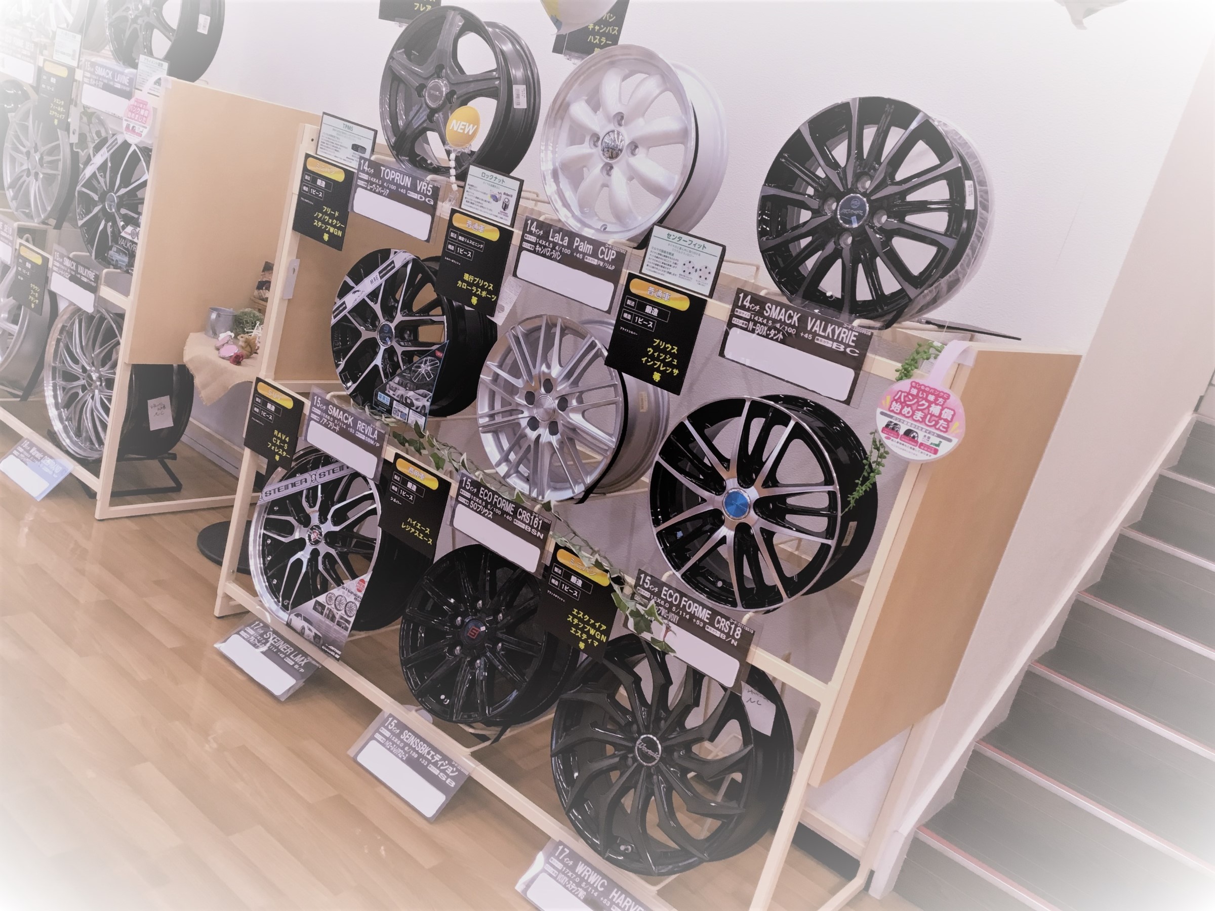 タイヤ館鎌ヶ谷では店内の入り口を入ってすぐ左に、個性的なアルミホイールを展示しています!ヾ( ^ω^)ノ