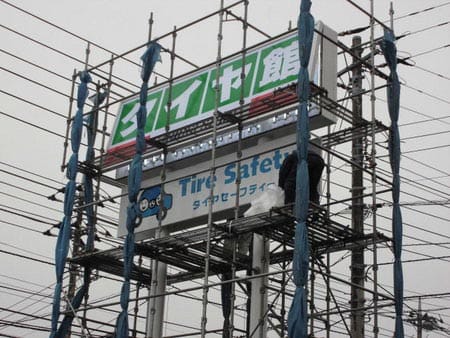 今日も雨の中、職人さん達が看板内の蛍光灯を全交換してました。