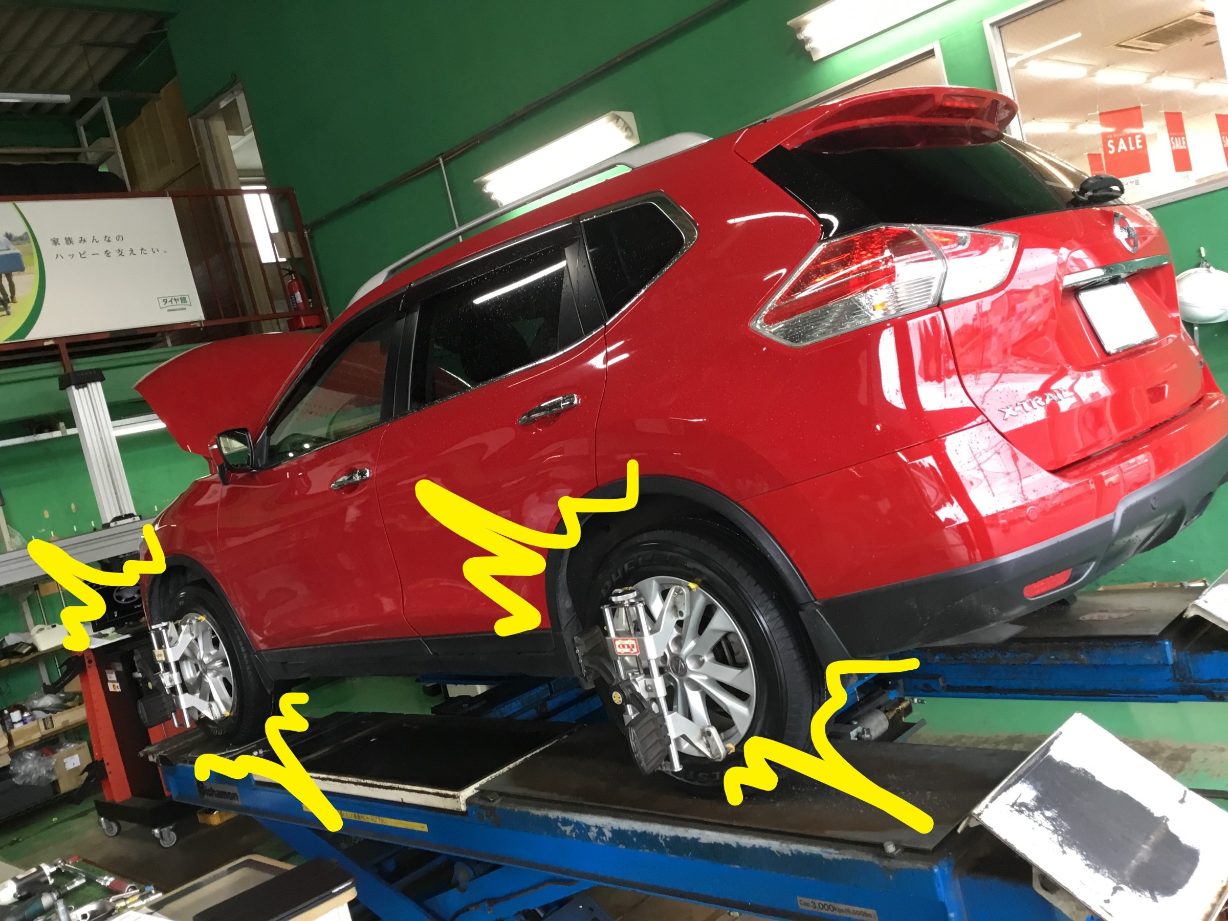 エクストレイルは前後ともタイヤの角度が調整できるので、しっかり角度の修正!