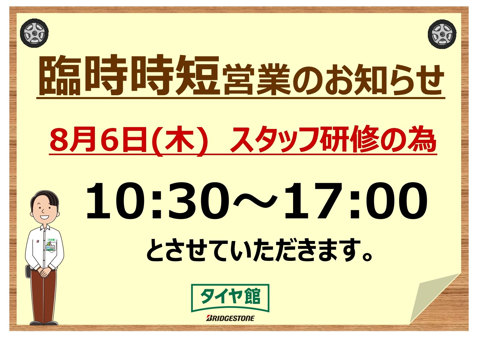 そんな中、明日8月6日(木)ですが、社員研修の為、誠に勝手ながら、営業時間を朝10:30~夕方17:00までの短縮営業となりますので、この場を借りて、ご案内させて頂きます。