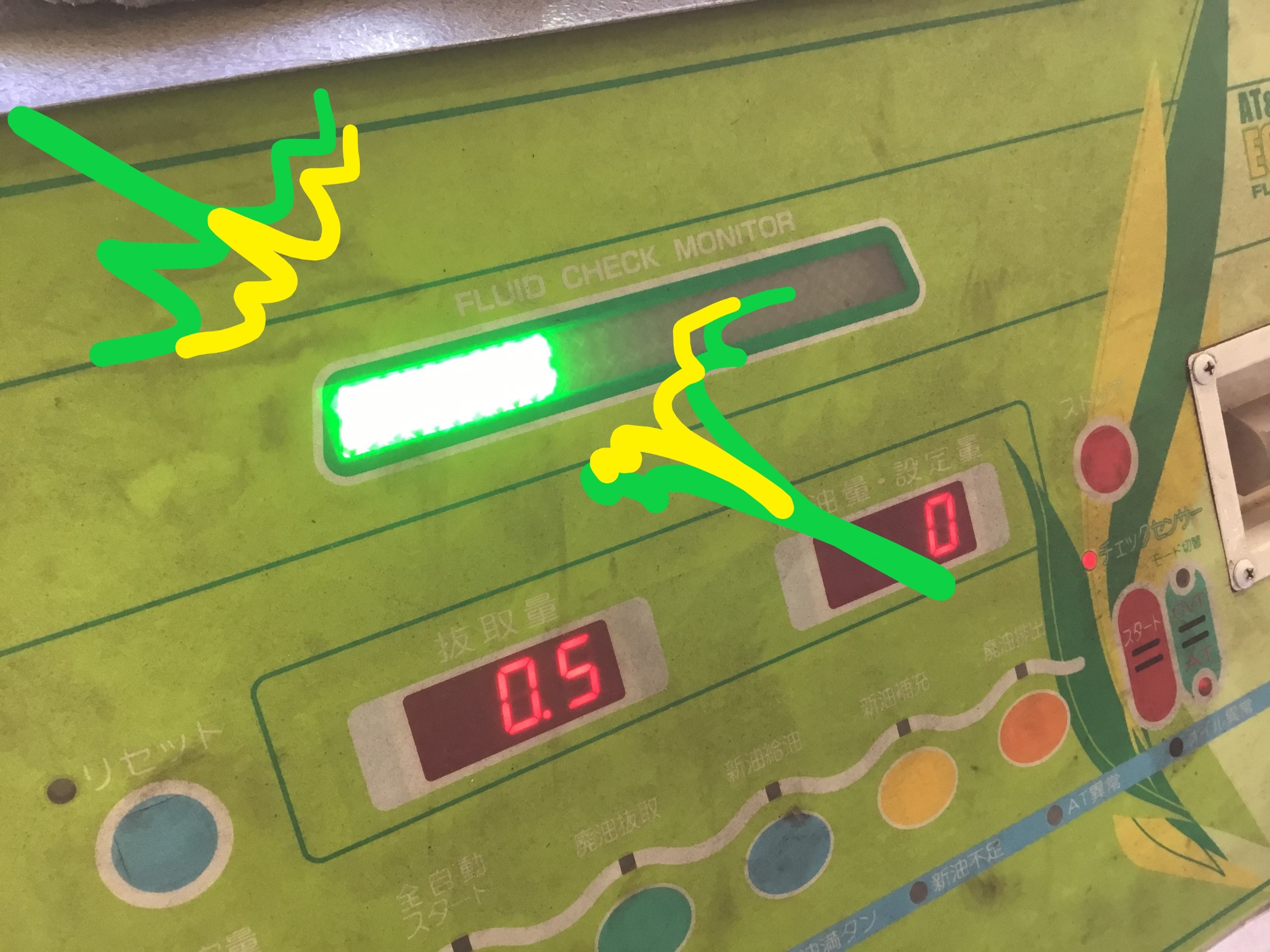 当店のATF交換機は緑黄赤の信号色でオイル汚れを表示するのですが、元々は真っ赤な判定!