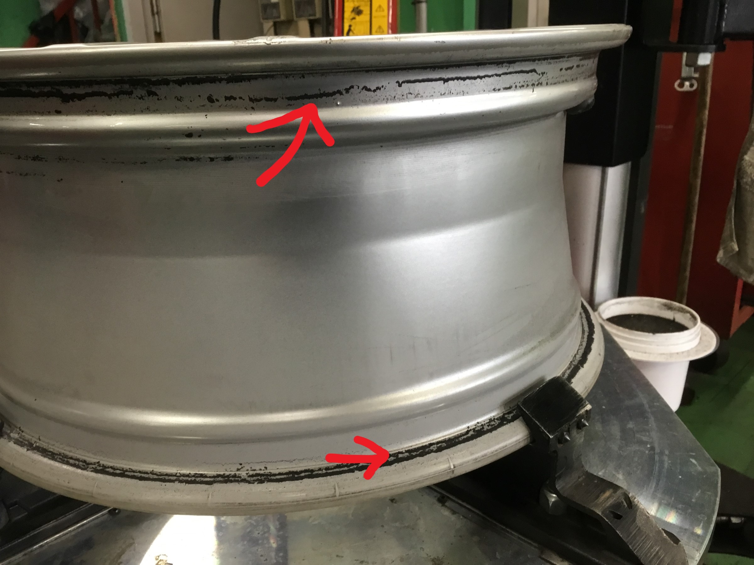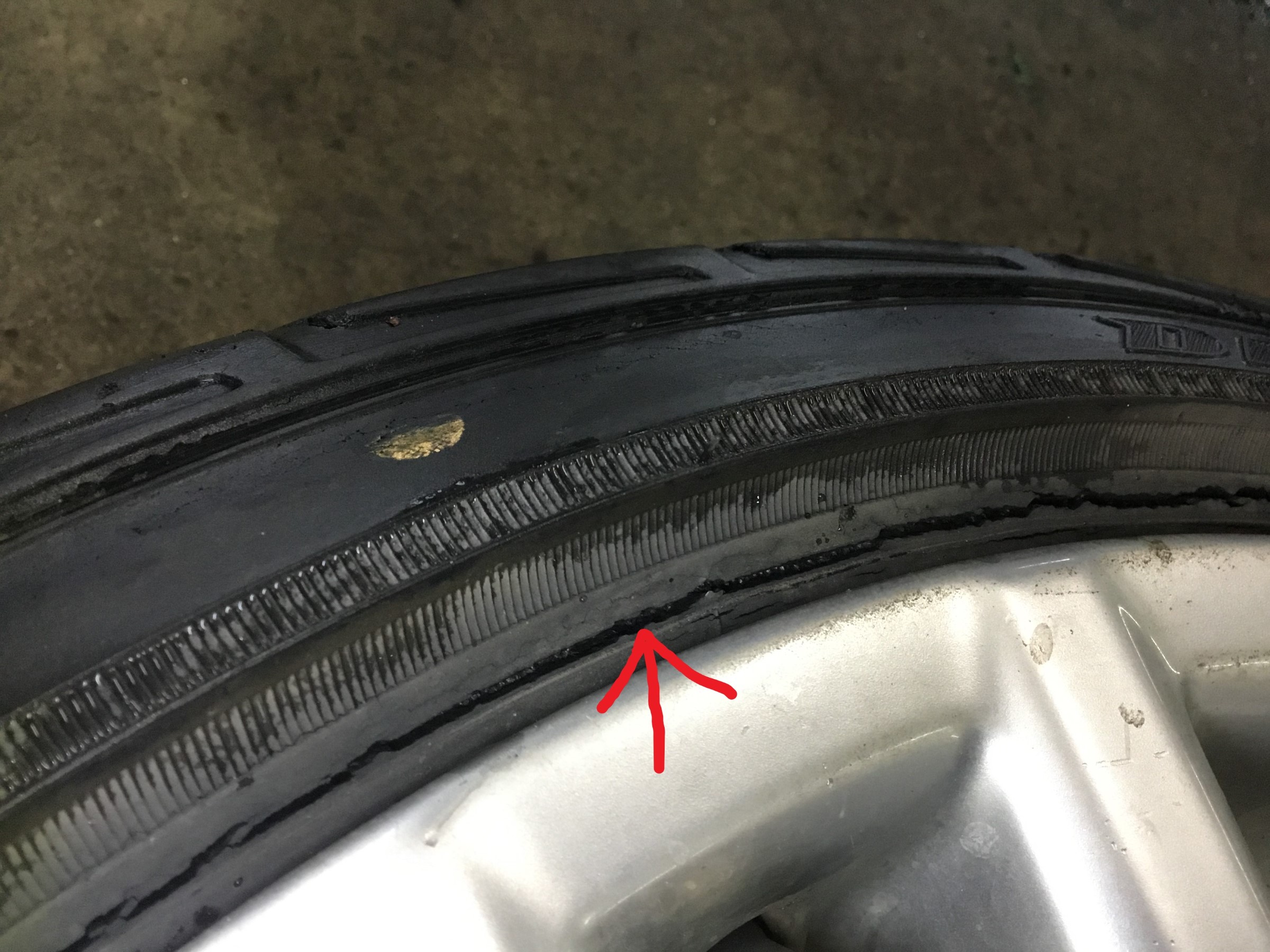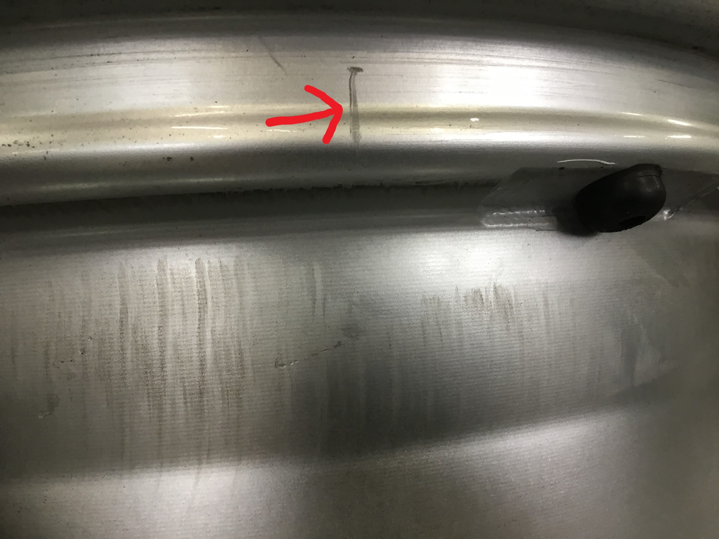 ホイールをチェックしていると、写真のような傷が・・・(´・ω・`)ここはタイヤとホイールが密着する大事な部分です。