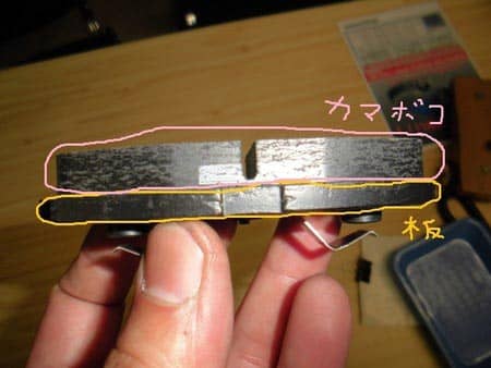 写真の物がブレーキパッドなんですが、カマボコのように板の上に具がのってます(笑)
