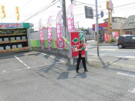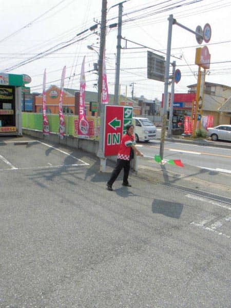 そのため、お店の駐車場入り口でスタッフが元気いっぱい旗振りをしております!
