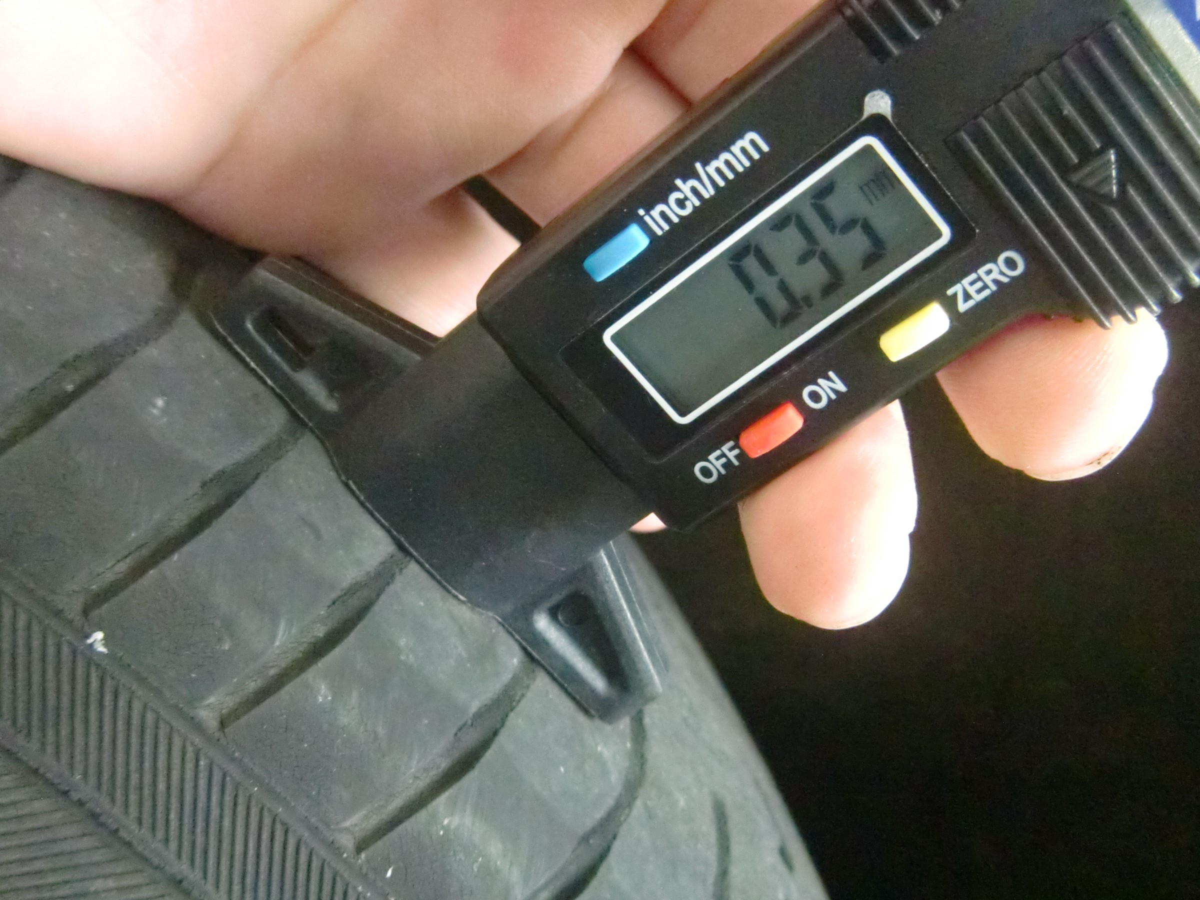 タイヤの外側のミゾはもうほとんど残っておらず、0.35mm!