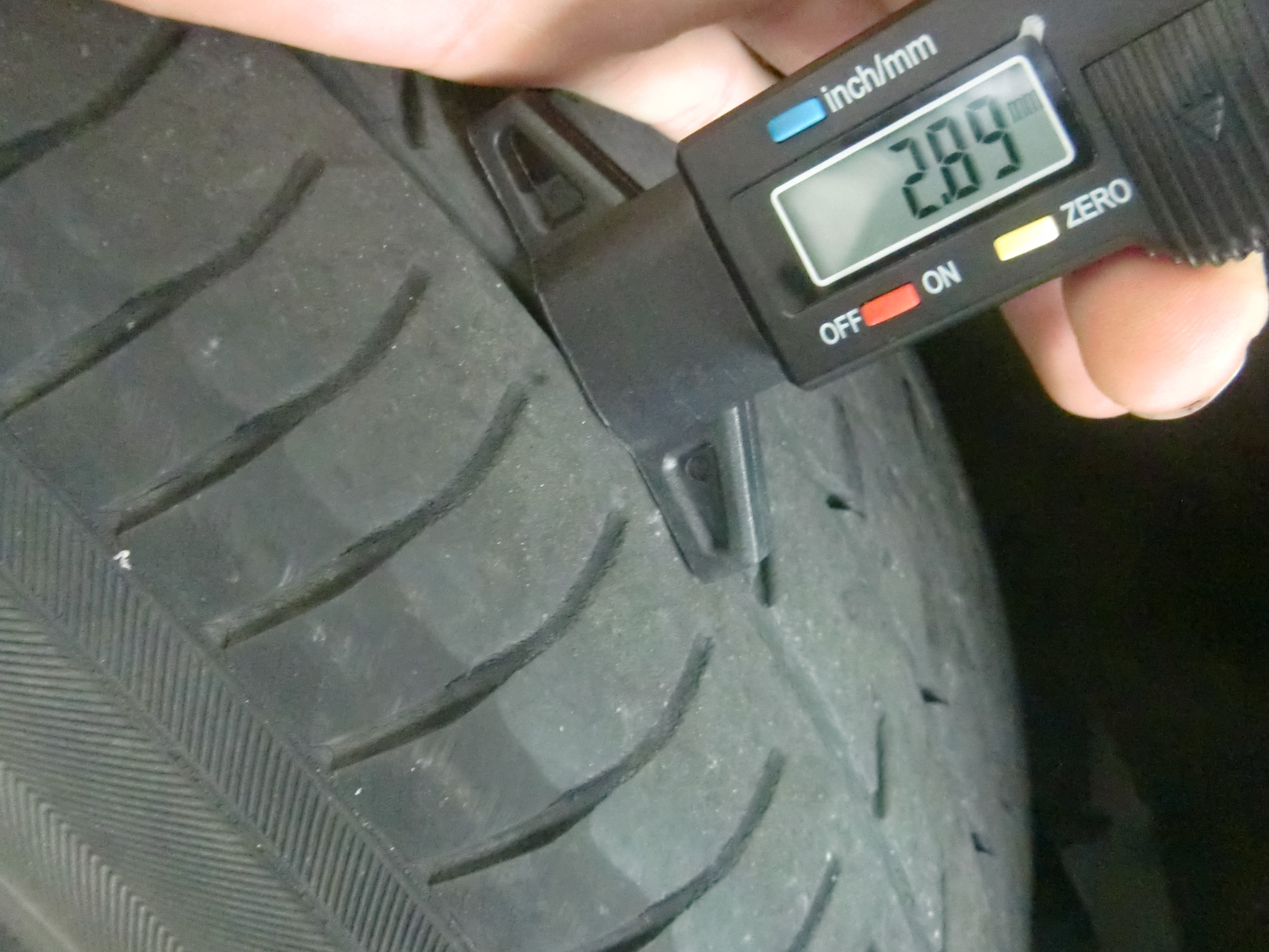 新品のタイヤは7~8mmほどですが、今のタイヤのセンターのミゾは2.89mm!