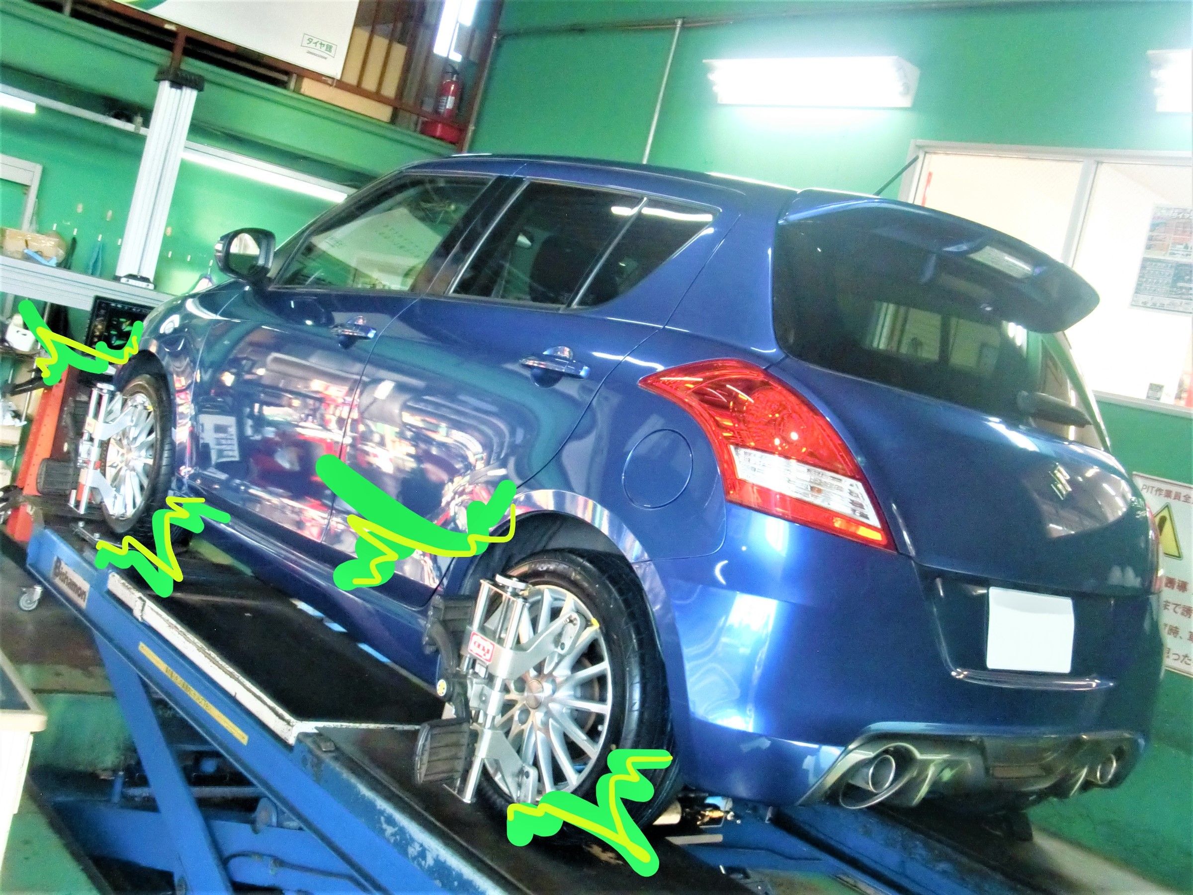 コチラのスイフトスポーツはフロントタイヤが過度な内股になっていたので、正常値の角度に修正させていただきました( `^ω^)=3 これにて完成っ!!