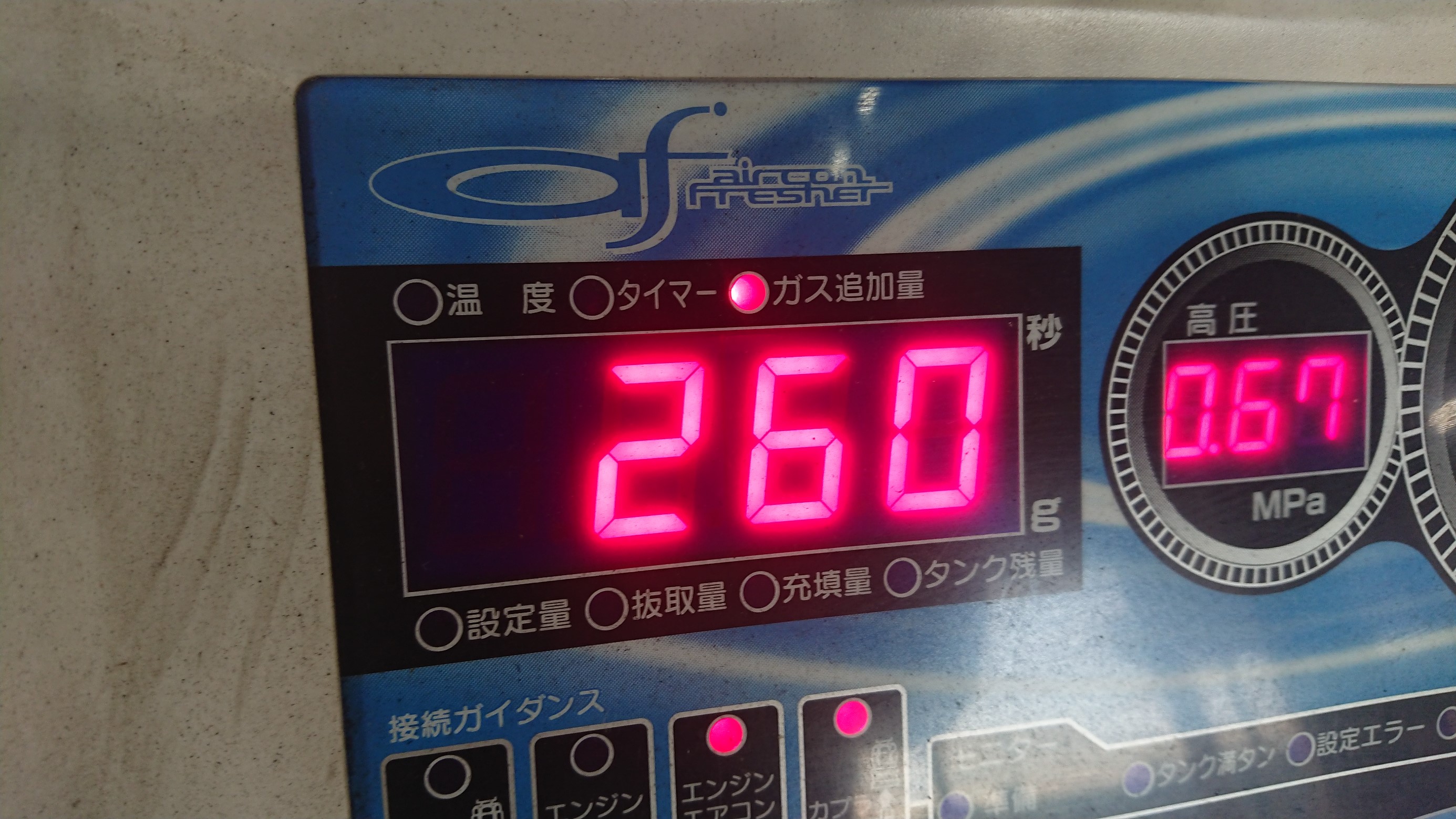 結果としては、260gのエアコンガスが抜けていたので補充させていただいています!