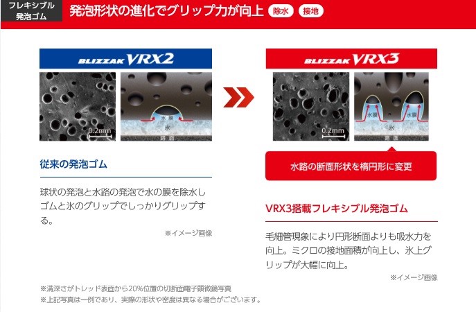 今まではタイヤ表面に球状の発泡と水路を作ってそこで水の膜を吸収していたのですが、今回のVRX3に搭載された“フレキシブル発泡ゴム”は楕円形の水路にすることによって毛細血管現象により水の膜の吸収率がアップ!