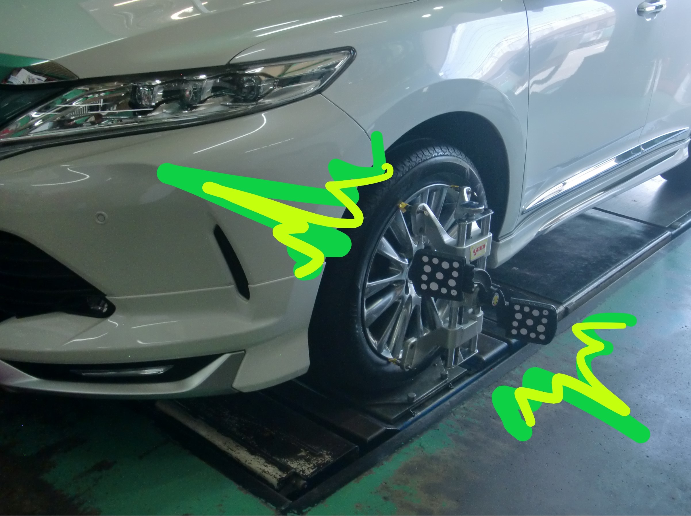 日常の走行やサスペンションのヘタりによってズレが生じてしまうタイヤの角度を補正してあげることでタイヤの本来の性能を発揮させ、ズレによって生じるタイヤの偏摩耗も抑制できる作業となっております(=゚ω゚)ノ