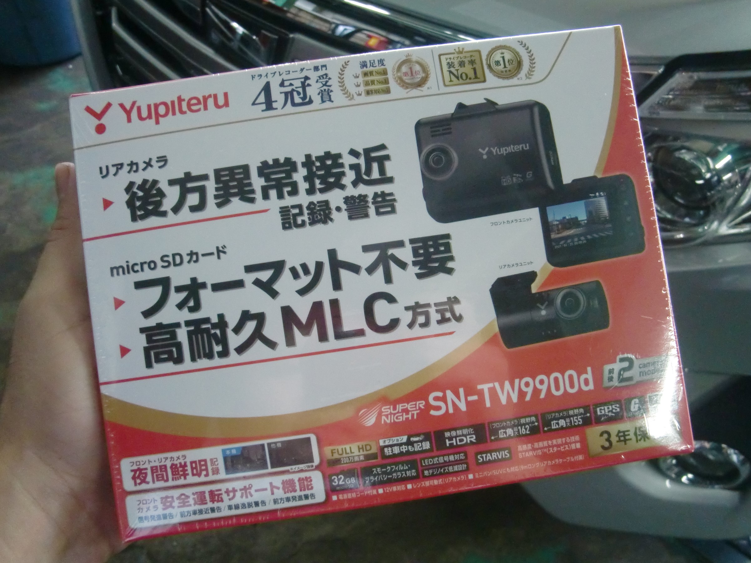 お取り付けさせていただく商品は、ボクも通勤車で愛用させていただいているユピテルの新前後撮影式ドライブレコーダー!