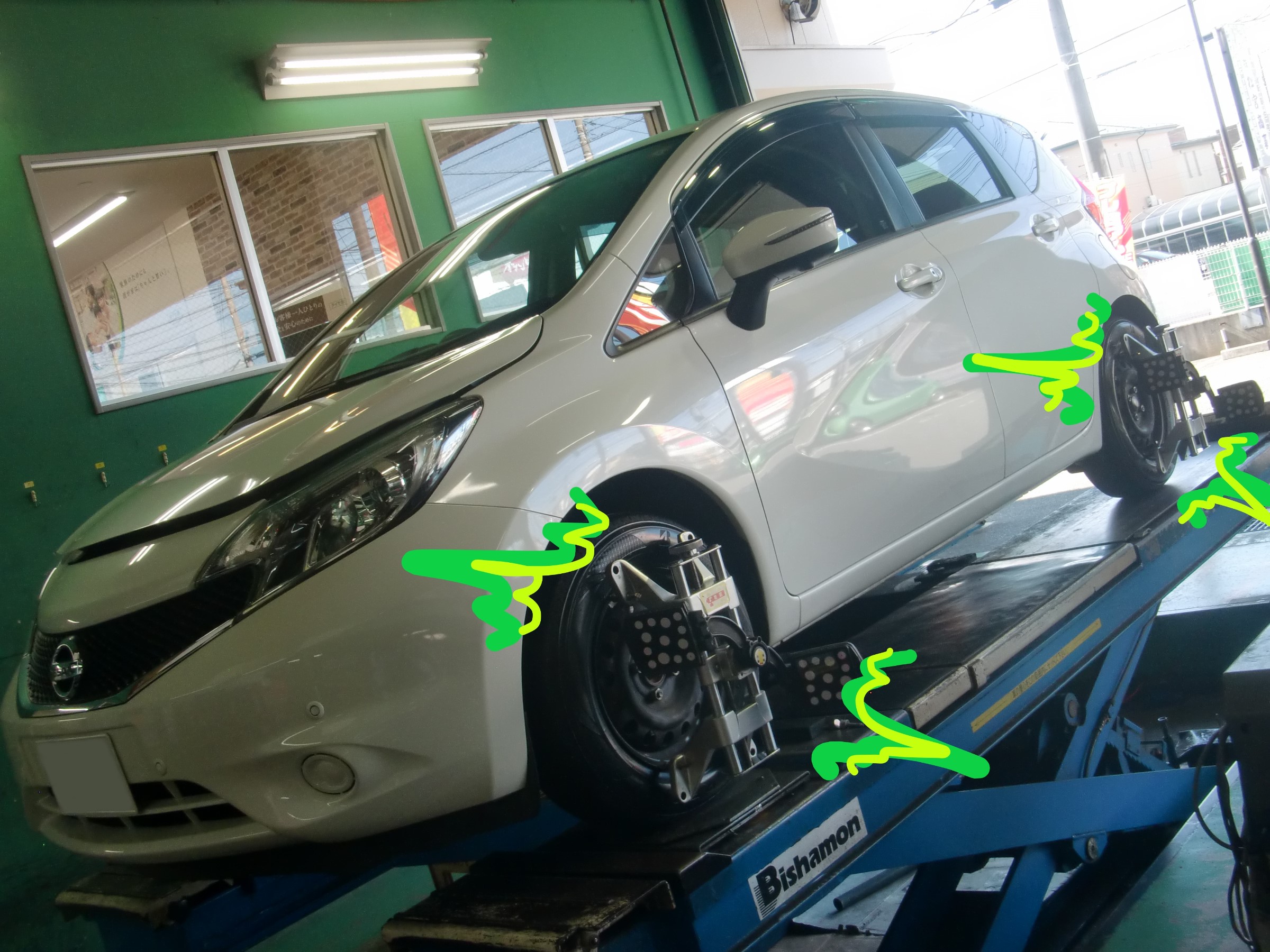 しっかりと左右のタイヤを基準値に補正させていただきまして、REGNOの性能を発揮しつつ快適なハンドリングで走行できるノートになりましたっ!ヽ(゚∀゚)メ(゚∀゚)ノ