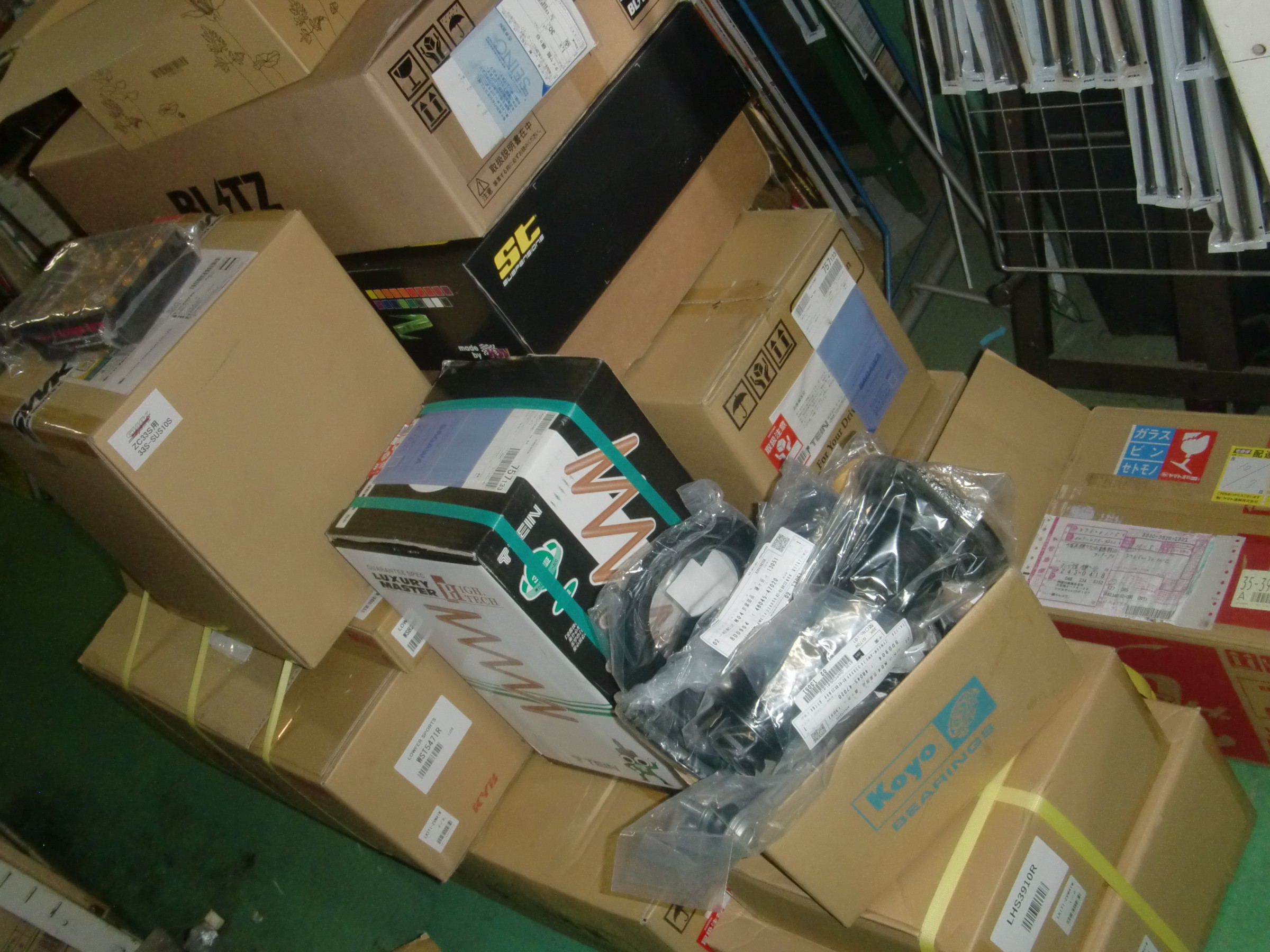 ぞくぞくと倉庫に積みあがっていく、取り付け待ちのサスペンションやマフラーなどの部品たち!!.+゚ヽ(`・ω・´)ノ.+゚