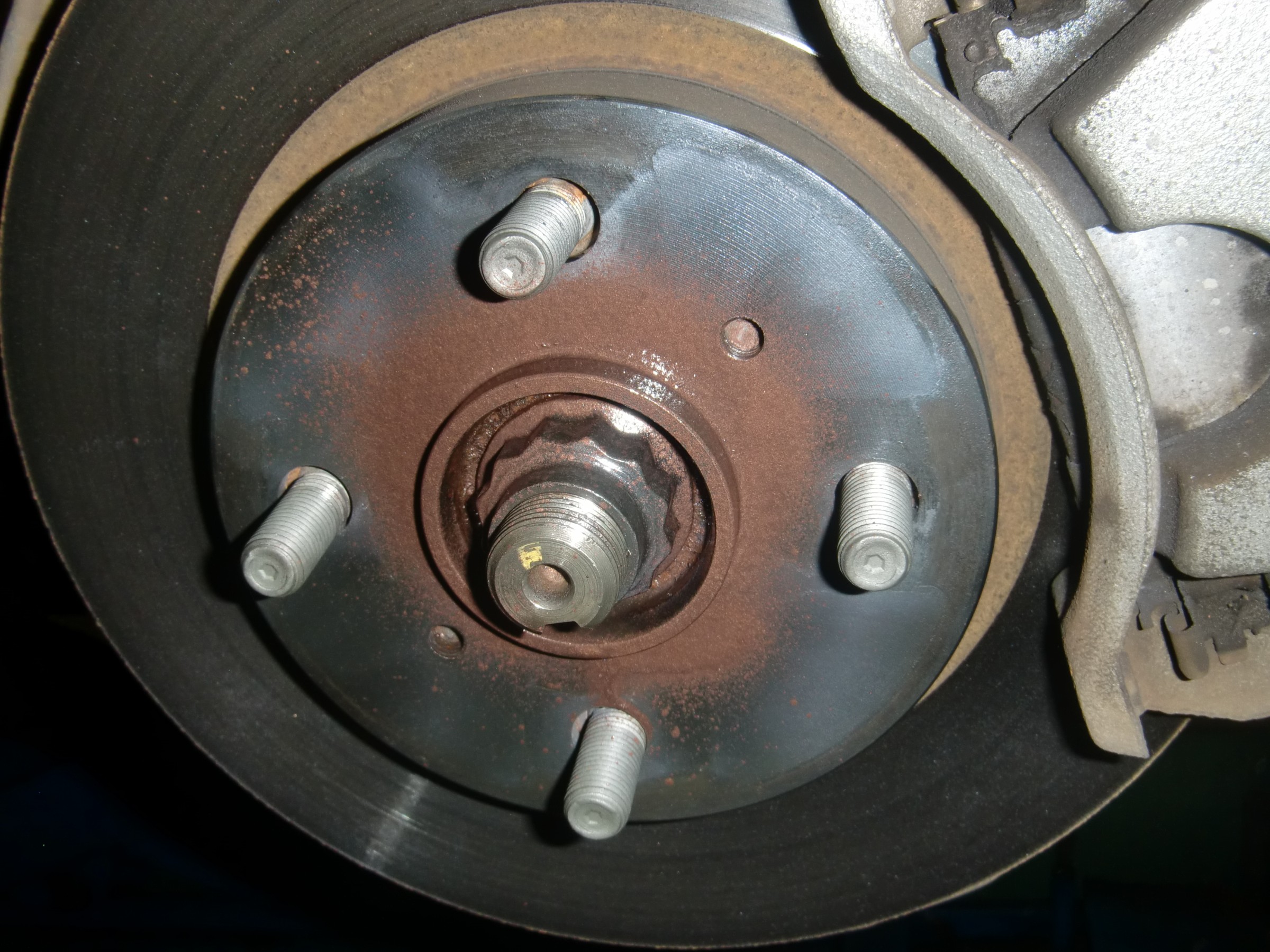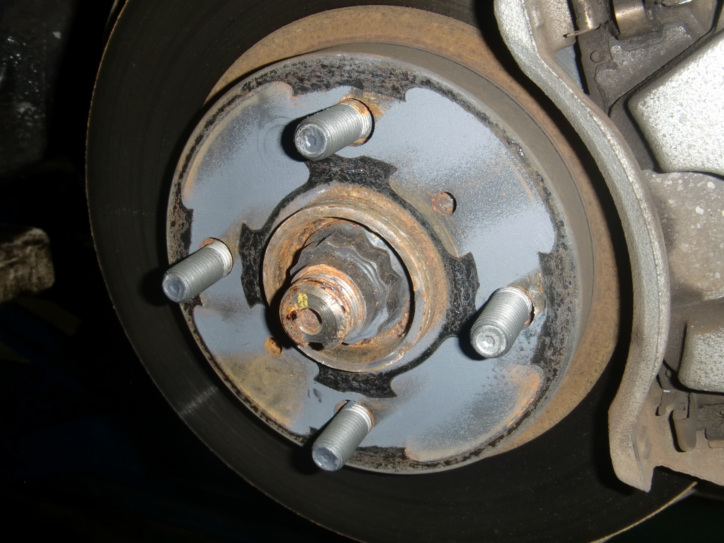 ホイールがハマるハブの部分はどうやら以前にディーラー様かどこかで防錆施工をしていらっしゃったご様子ですが、施工部分が剥がれてしまってサビが浮いてしまっていました(;´∀`)