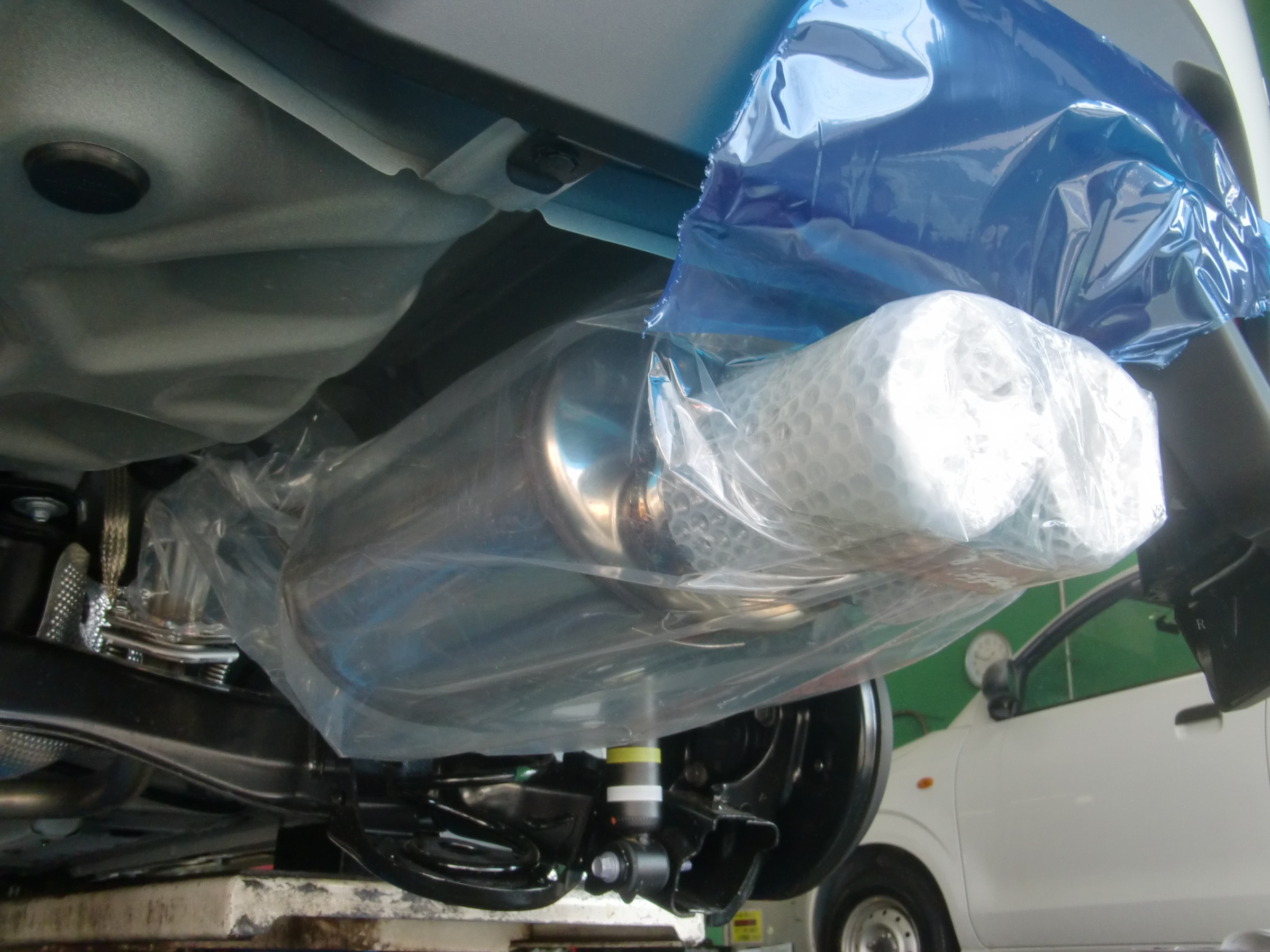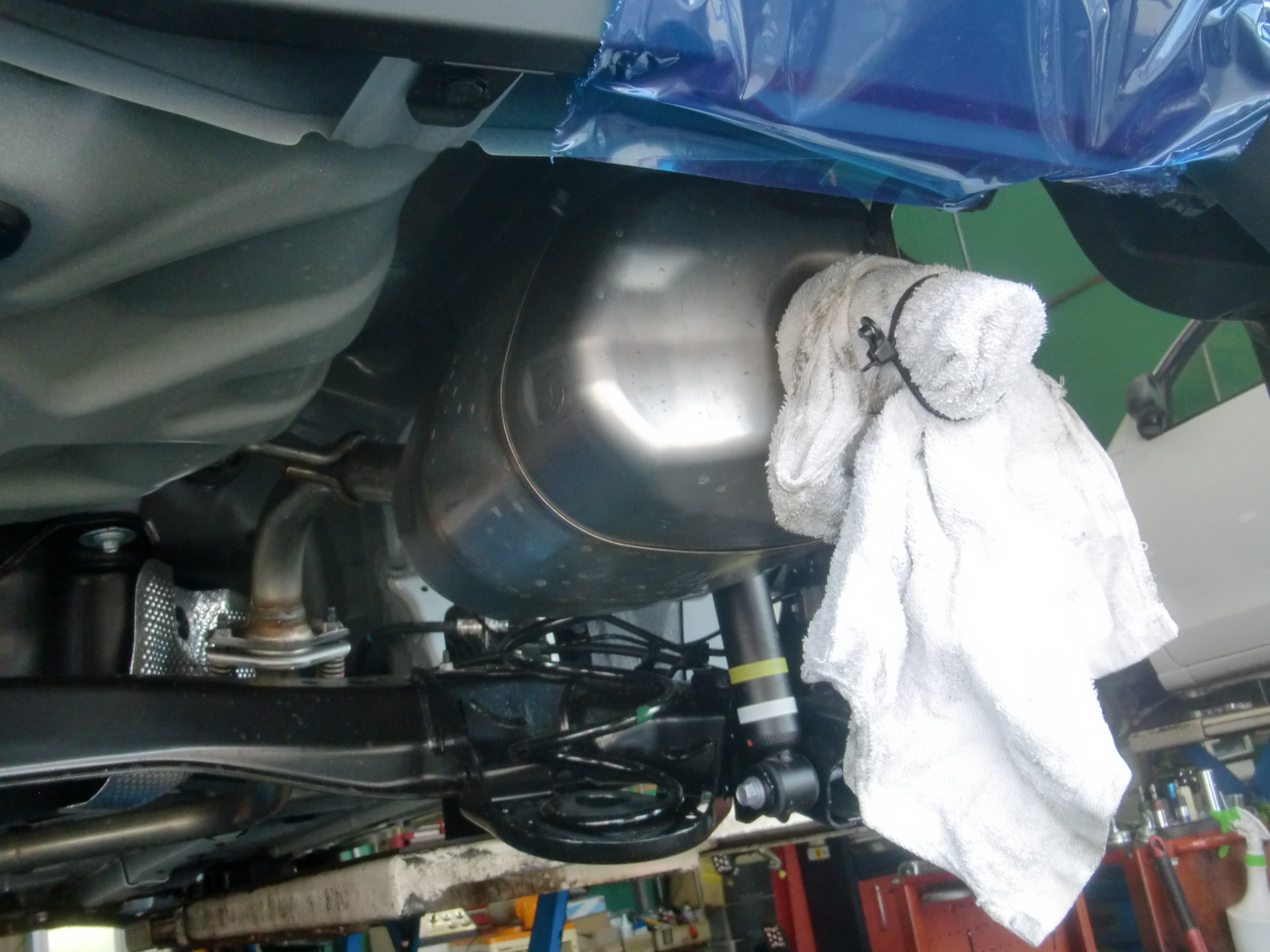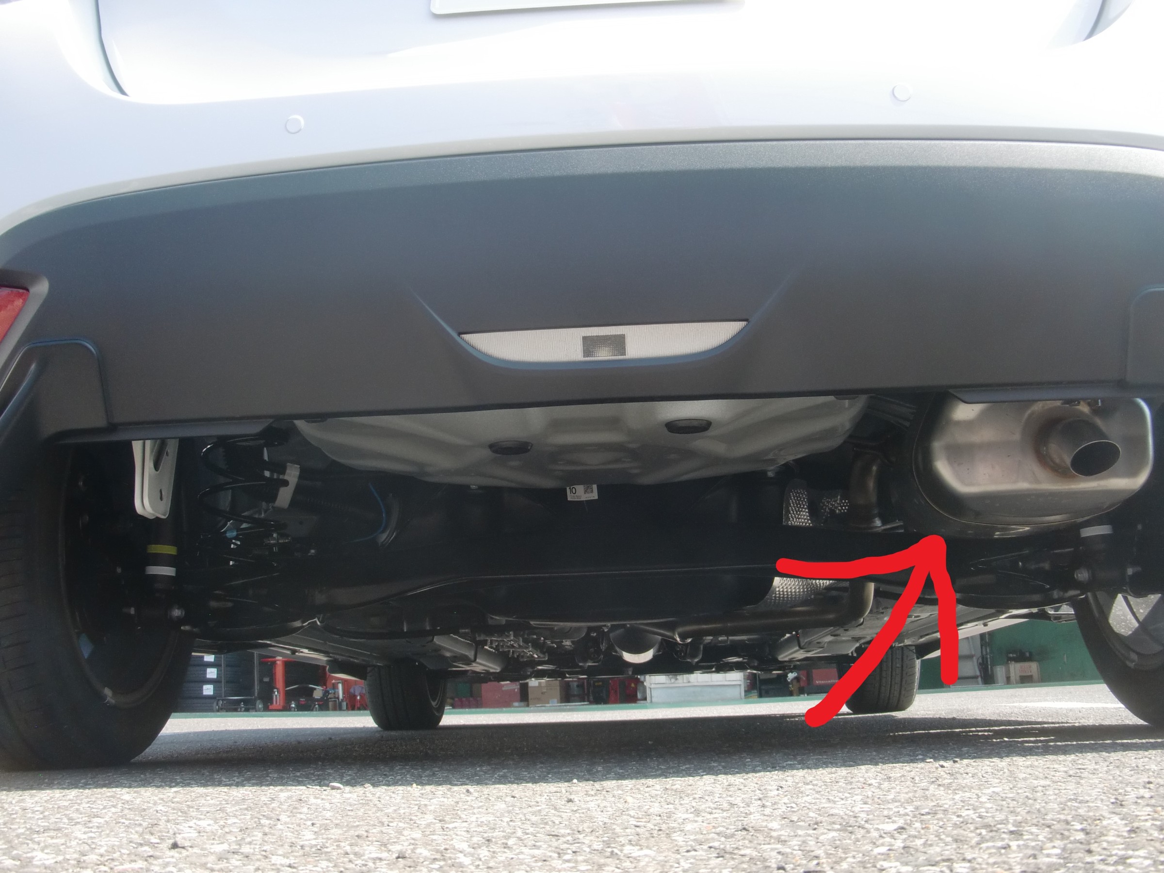 ローアングルで覗いたらドルフィンテール気味のノーマルマフラーがいました(ΦωΦ)最近の車はマフラーが隠されすぎー!!