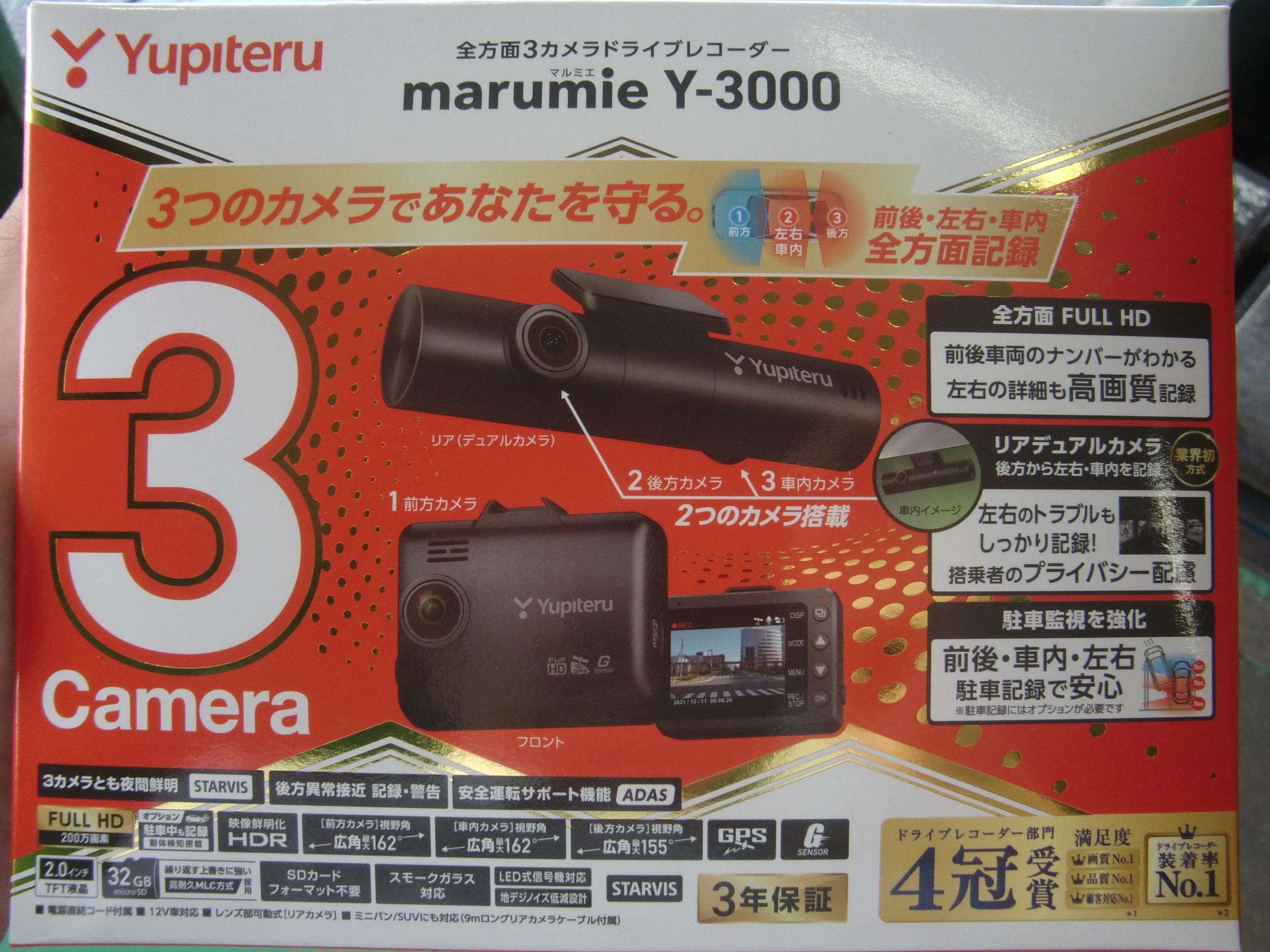 今回装着させていただくのは、前方&後方&室内を映す3カメラ方式のドライブレコーダー、ユピテルY-3000!!