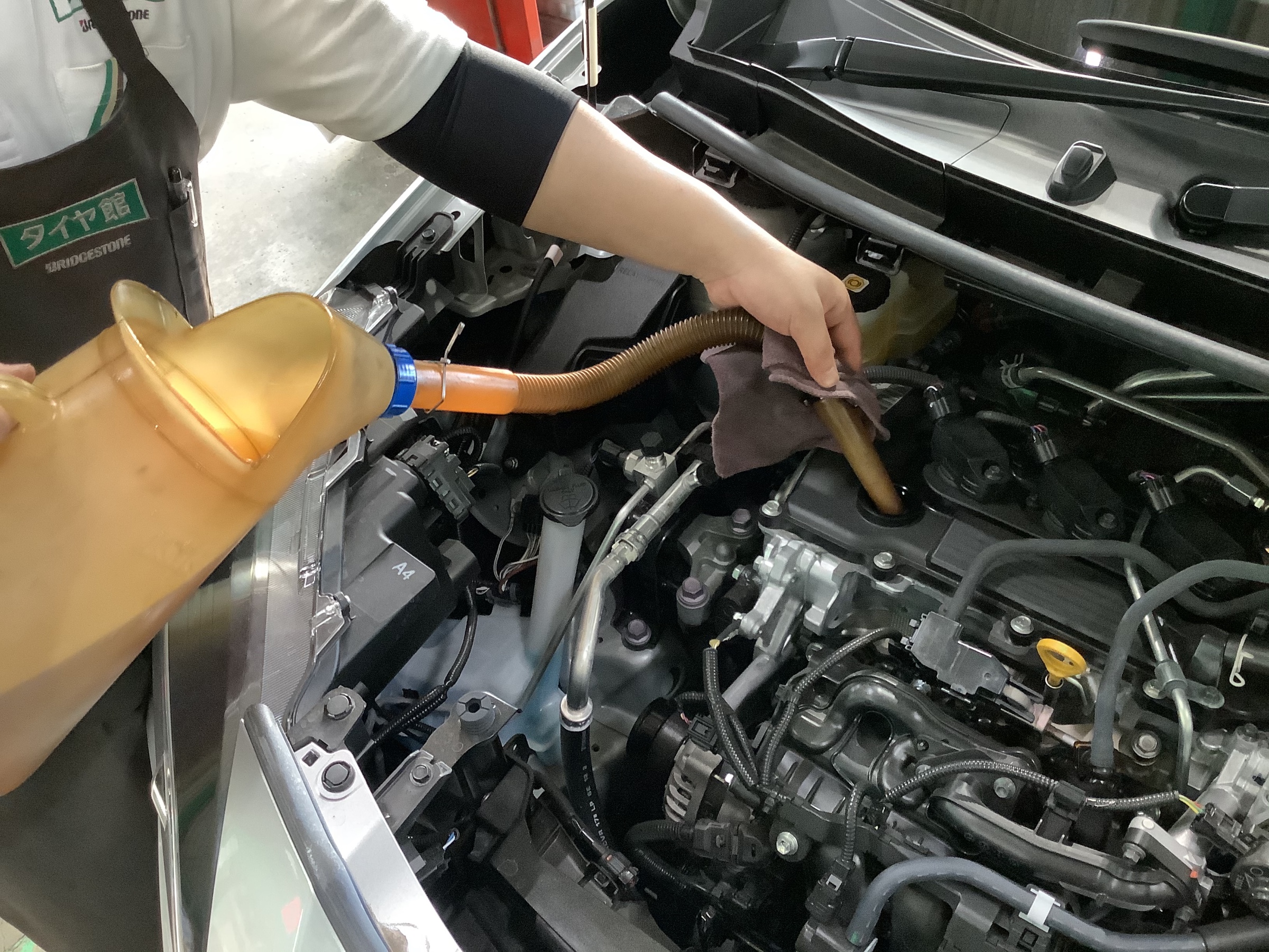当店はタイヤ交換だけでなく、おクルマのメンテナンスも得意です。もちろんエンジンオイル交換もお任せください。