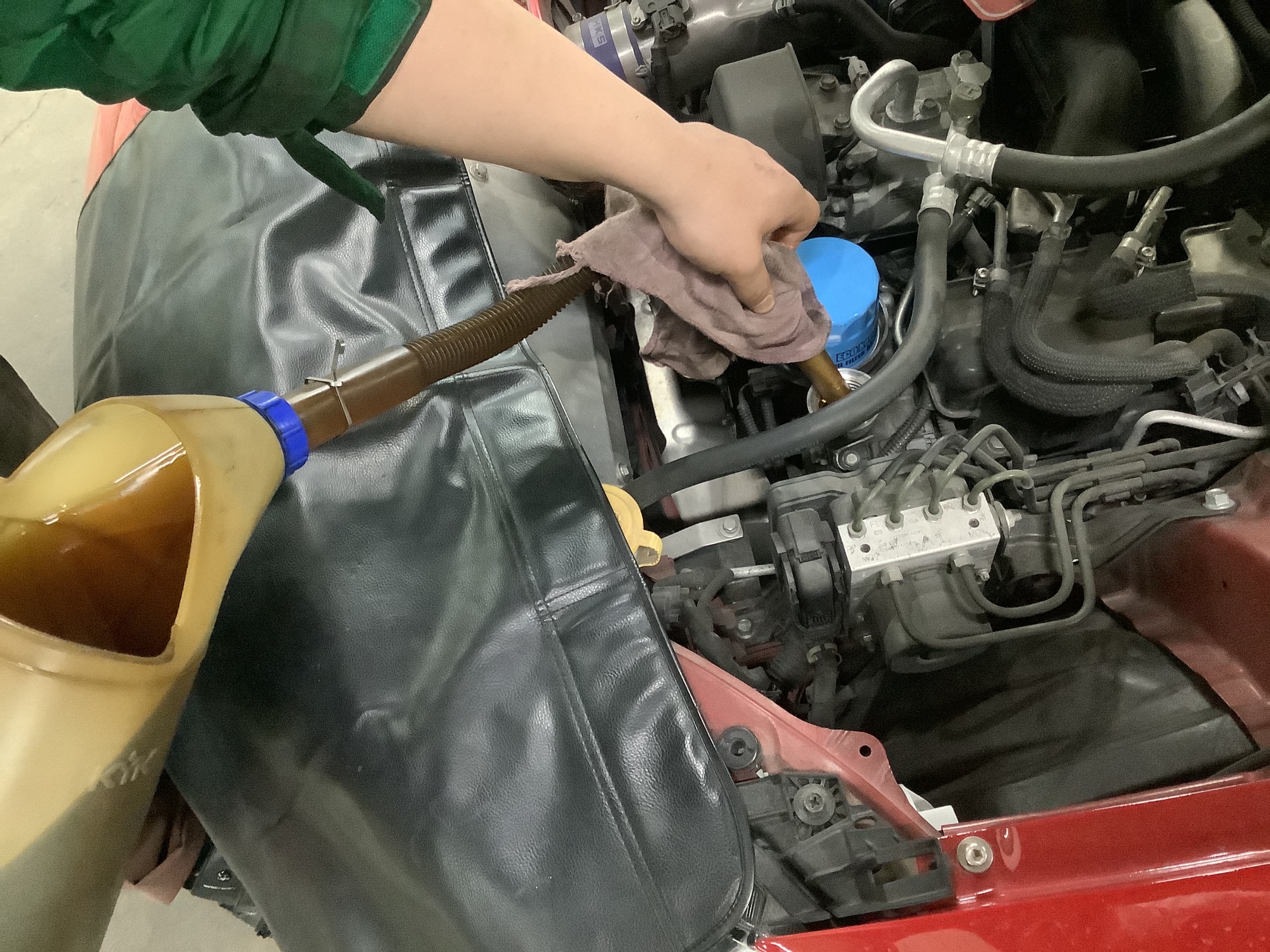当店のオイル交換の手順をご紹介しましょう。まず交換前にオイルの量と汚れをチェックし、点検結果をお客さまに報告します。オイルフィラーキャップを外し、キズ等の痛みや水の混入を示す症状が無いかなども確認します。またオイルを抜くドレンボルト部のオイル漏れの確認も行います。