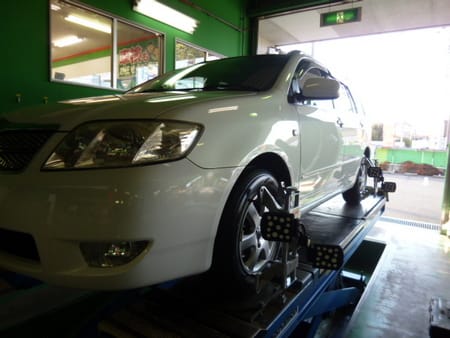 タイヤを交換した後はアライメント調整!案の定、タイヤをヒットした左前タイヤの角度が大きくズレていました。。。