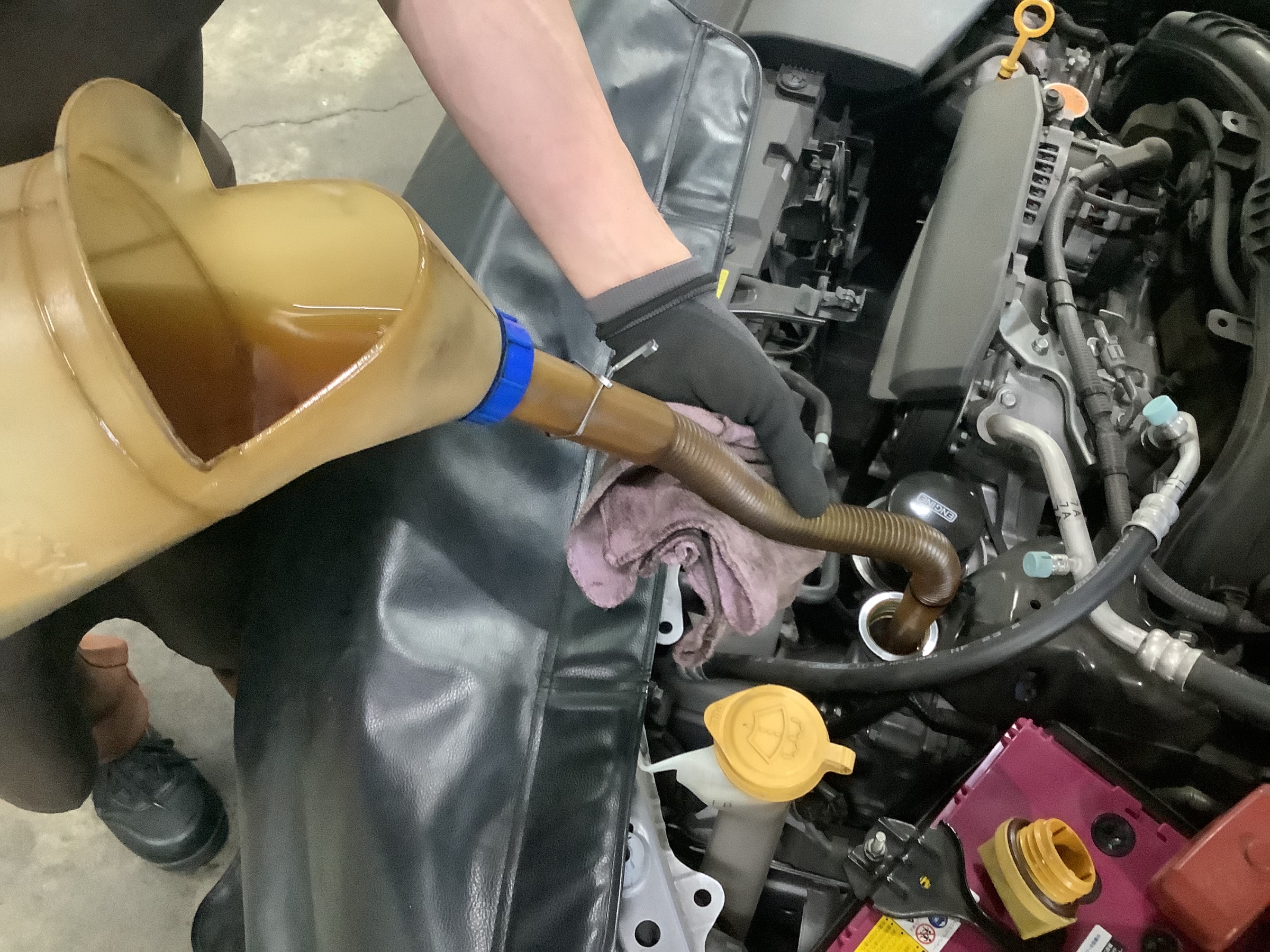 規定量のエンジンオイルを注入します。