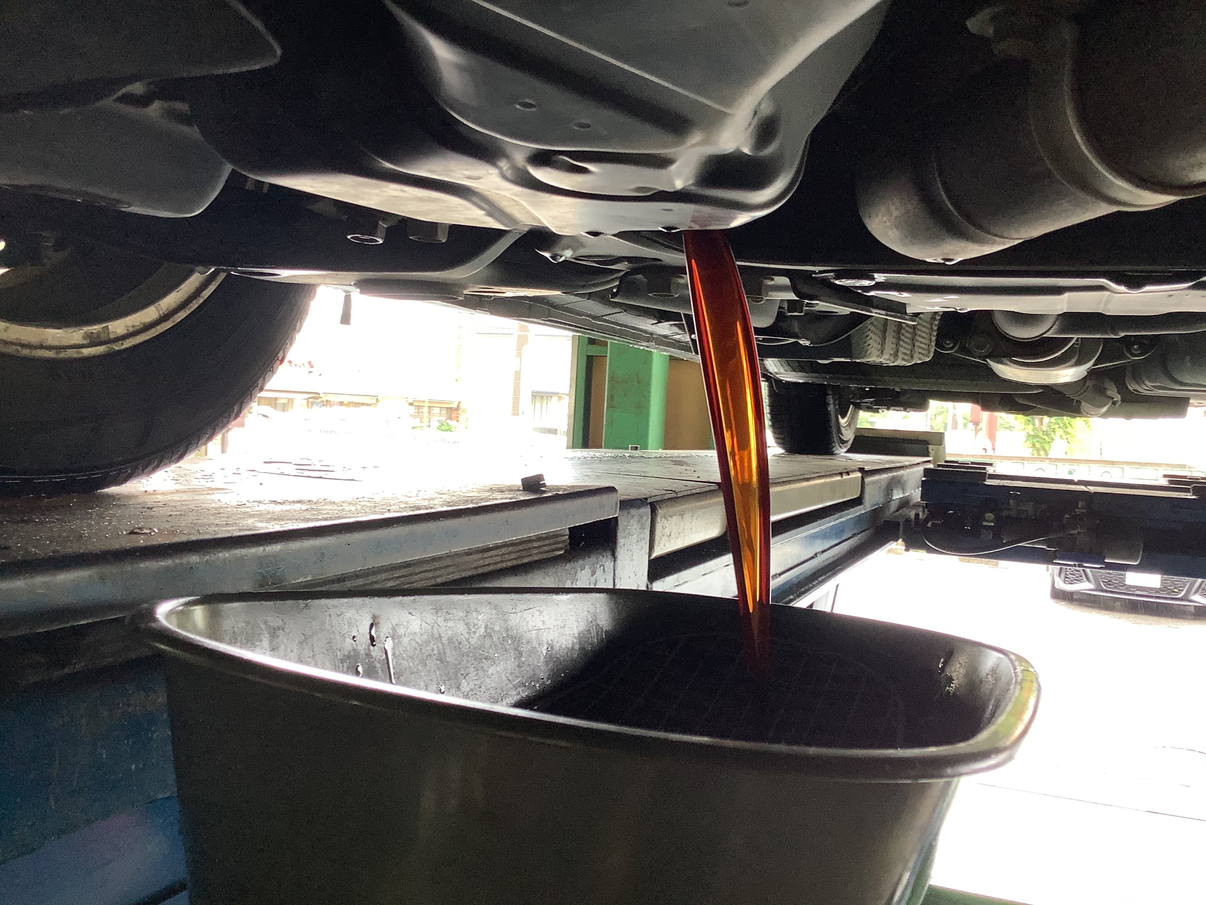 当店のオイル交換の手順をご紹介しましょう。まず交換前にオイルの量と汚れをチェックし、点検結果をお客さまに報告します。オイルフィラーキャップを外し、キズ等の痛みや水の混入を示す症状が無いかなども確認します。またオイルを抜くドレンボルト部のオイル漏れの確認も行います。