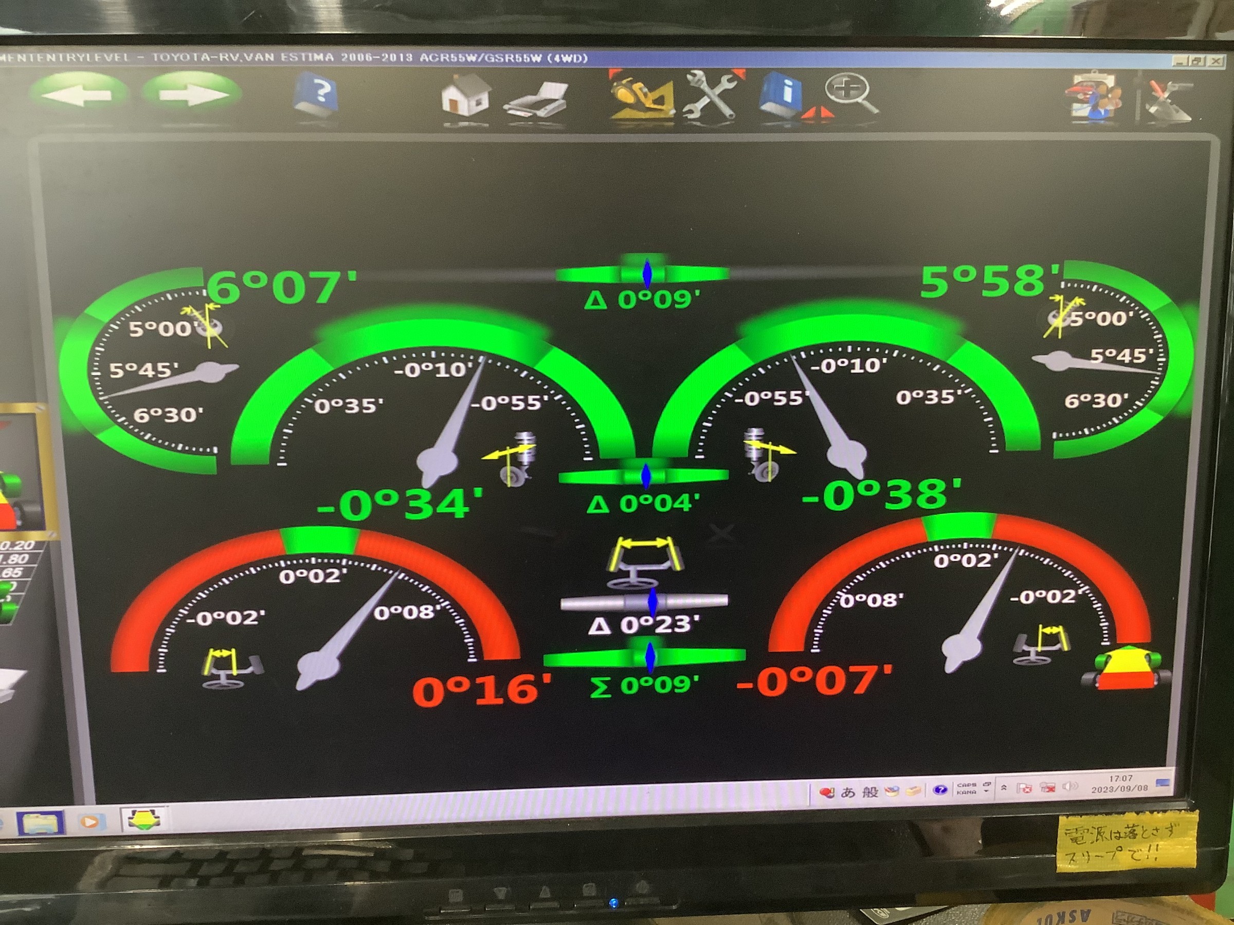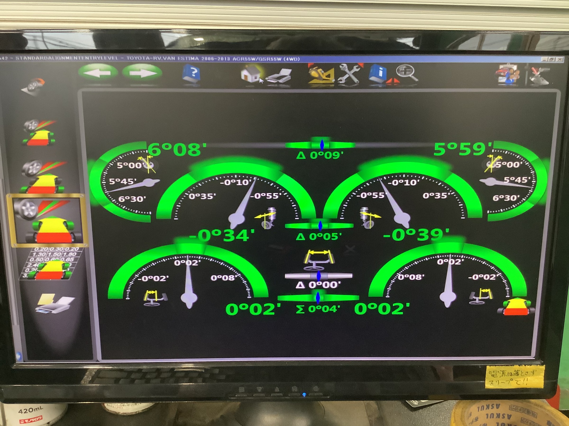 エスティマは前輪のトーを左右調整できるので、こちらを調整させていただき