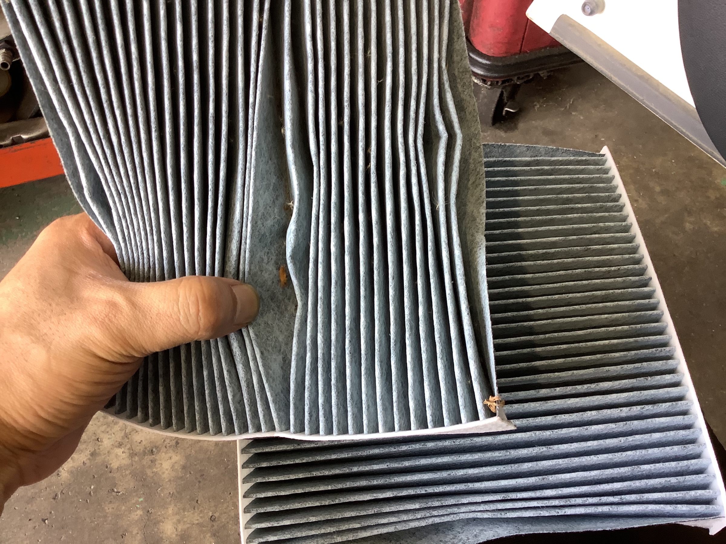 例えばこちらの写真は、手前が新品のエアコンフィルター、そして奥が使い古したもの。その差は一目瞭然ですね。