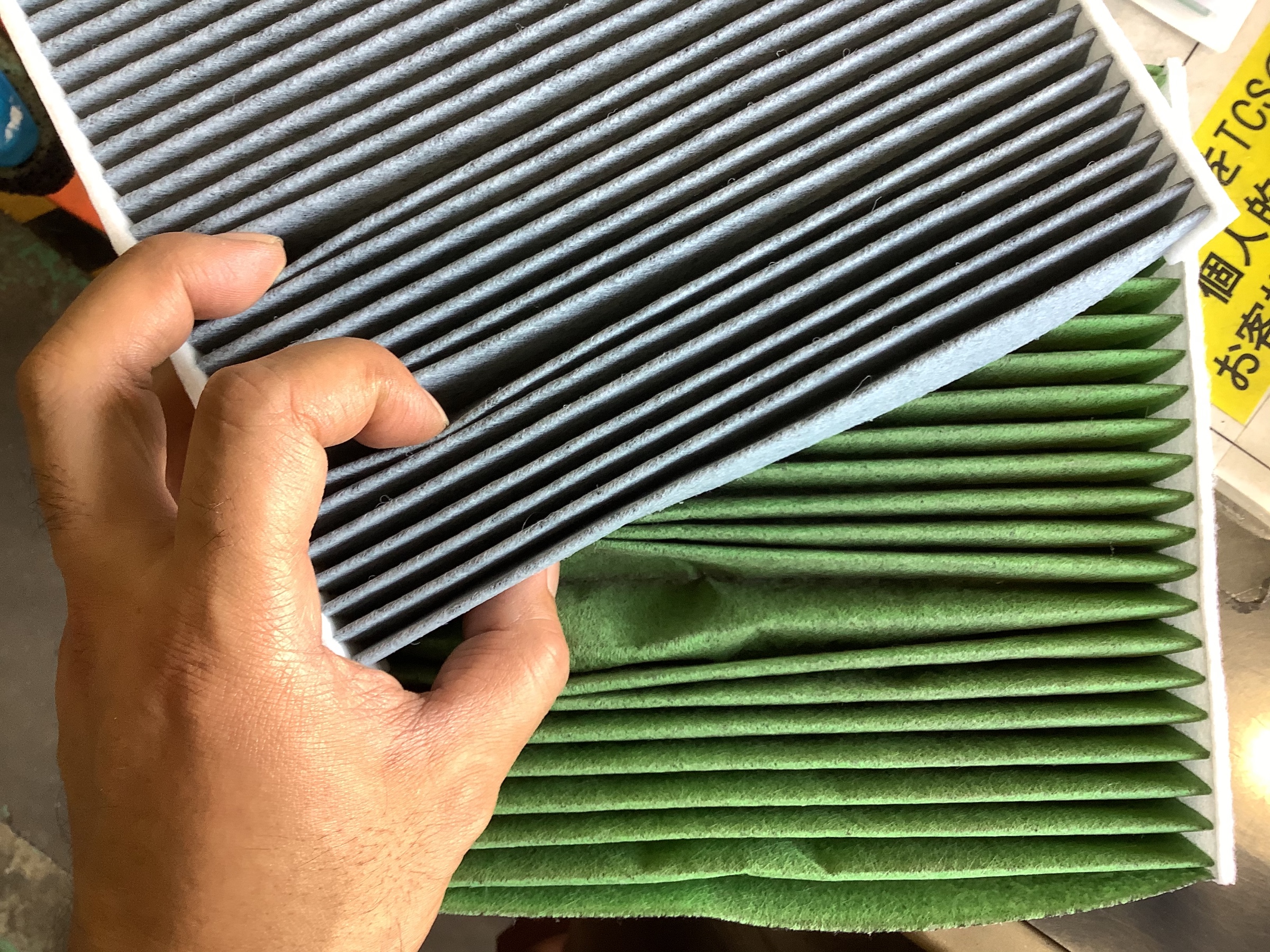 例えばこちらの写真は、手前が新品のエアコンフィルター、そして奥が使い古したもの。その差は一目瞭然ですね。