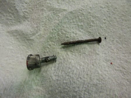 点検してみると1枚目のようにデカいボルトが刺さっていました;;