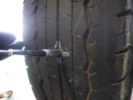 よくある修理方法に「外面修理」という、タイヤに刺さった釘を抜いたところに外側からビーフジャーキーみたいな修理剤をぶち込む修理方法があります。