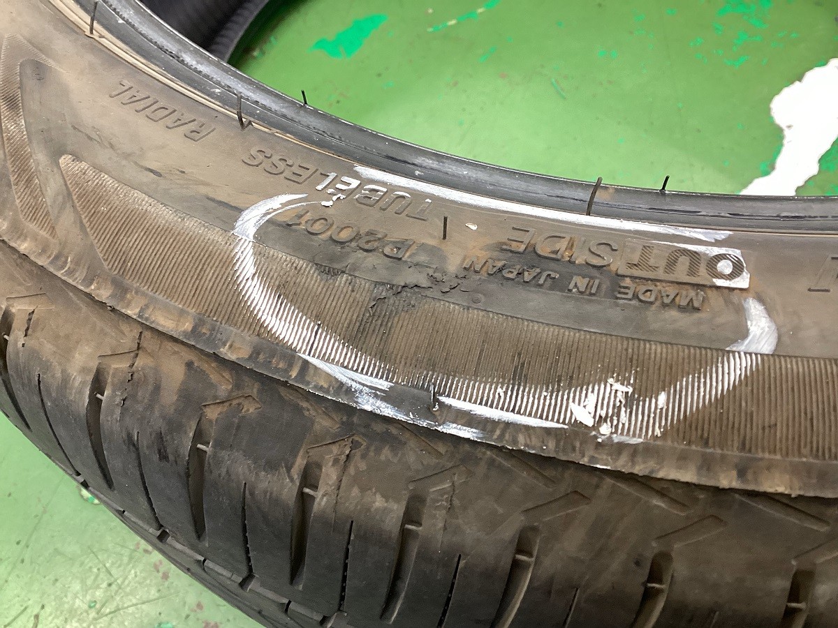 交換前のタイヤは横を打って、パンクしておりました