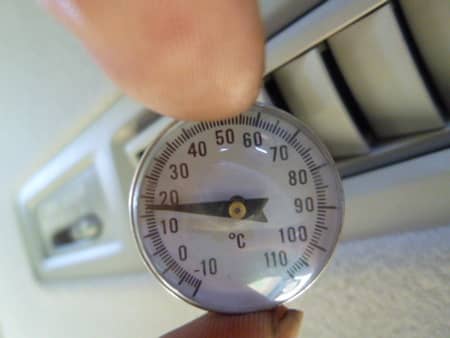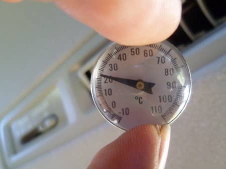 後部座席の冷えが悪いとのことで施工前に風の温度を計ってみると、最強の冷風でも22℃ほどでした!