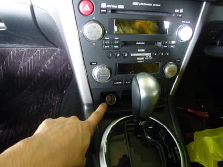 本来なら電源はシガーソケットからなのですが、BP型レガシィのシガーソケットは2枚目写真で指を指しているシフトレバーの前のカバーを開けた箇所・・・
