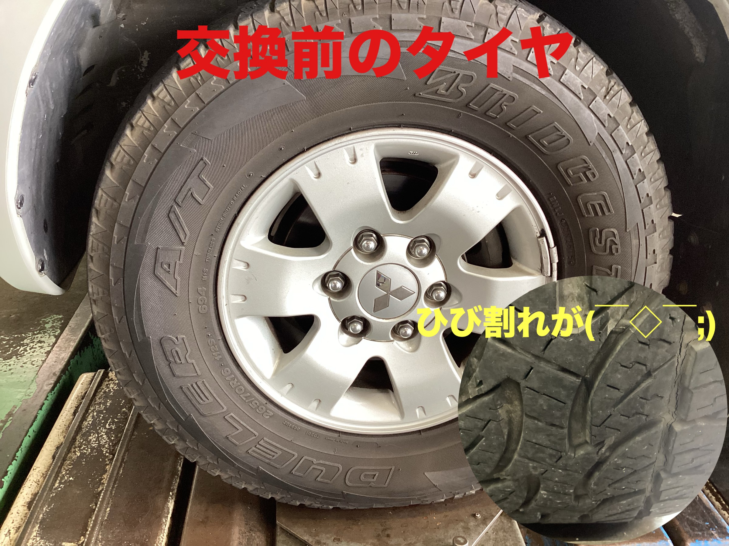 【三菱パジェロ】ひび割れたタイヤを最新のオールテレーンタイヤ「DUELER A/T 002」に交換!スペアタイヤ含む5本交換&アライメント調整で安心・快適ドライブ!