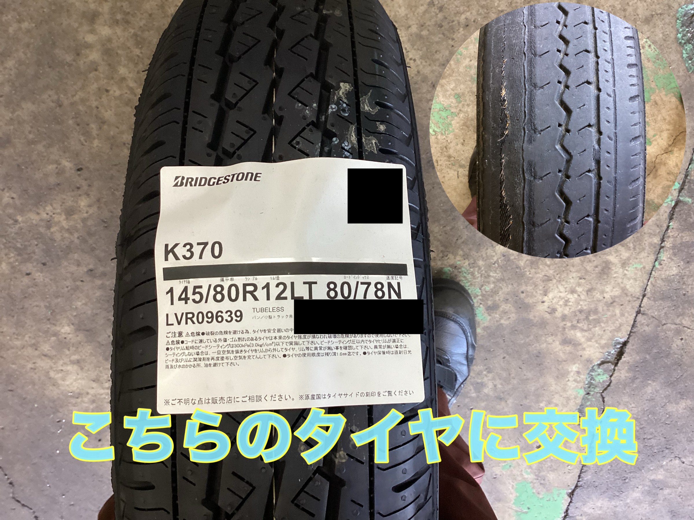 今回交換させていただいたタイヤは、ブリヂストンタイヤの商用車用タイヤ 「K370」、サイズは 145/80R12 80/78N です。このK370は、高い耐久性と経済性を兼ね備え、毎日の走行をしっかり支えるブリヂストンの自信作!お仕事でハイゼットをお使いの方には特におすすめのタイヤです。