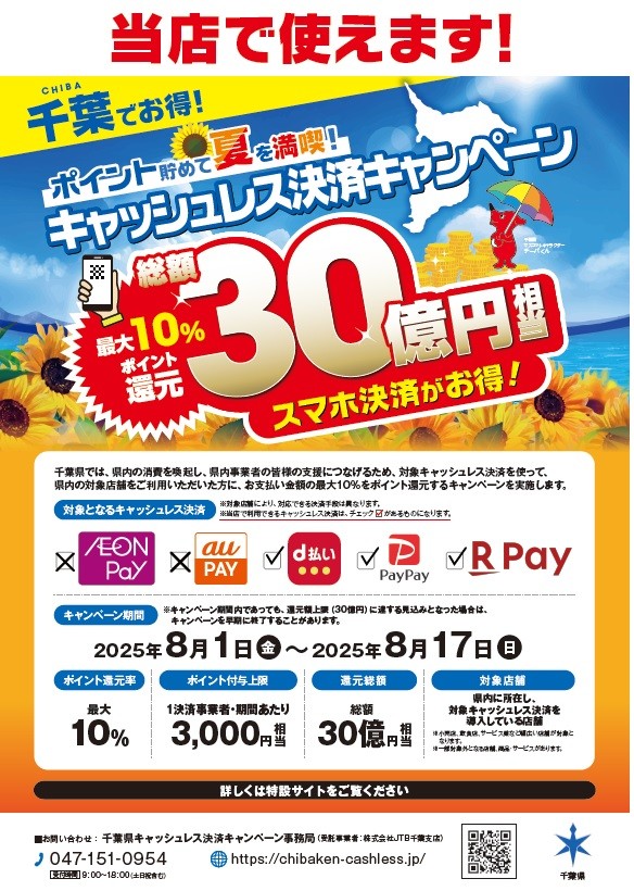 8/1(金)~8/17㈰ 千葉でお得!ポイント貯めて夏を満喫!キャッシュレス決済キャンペーン