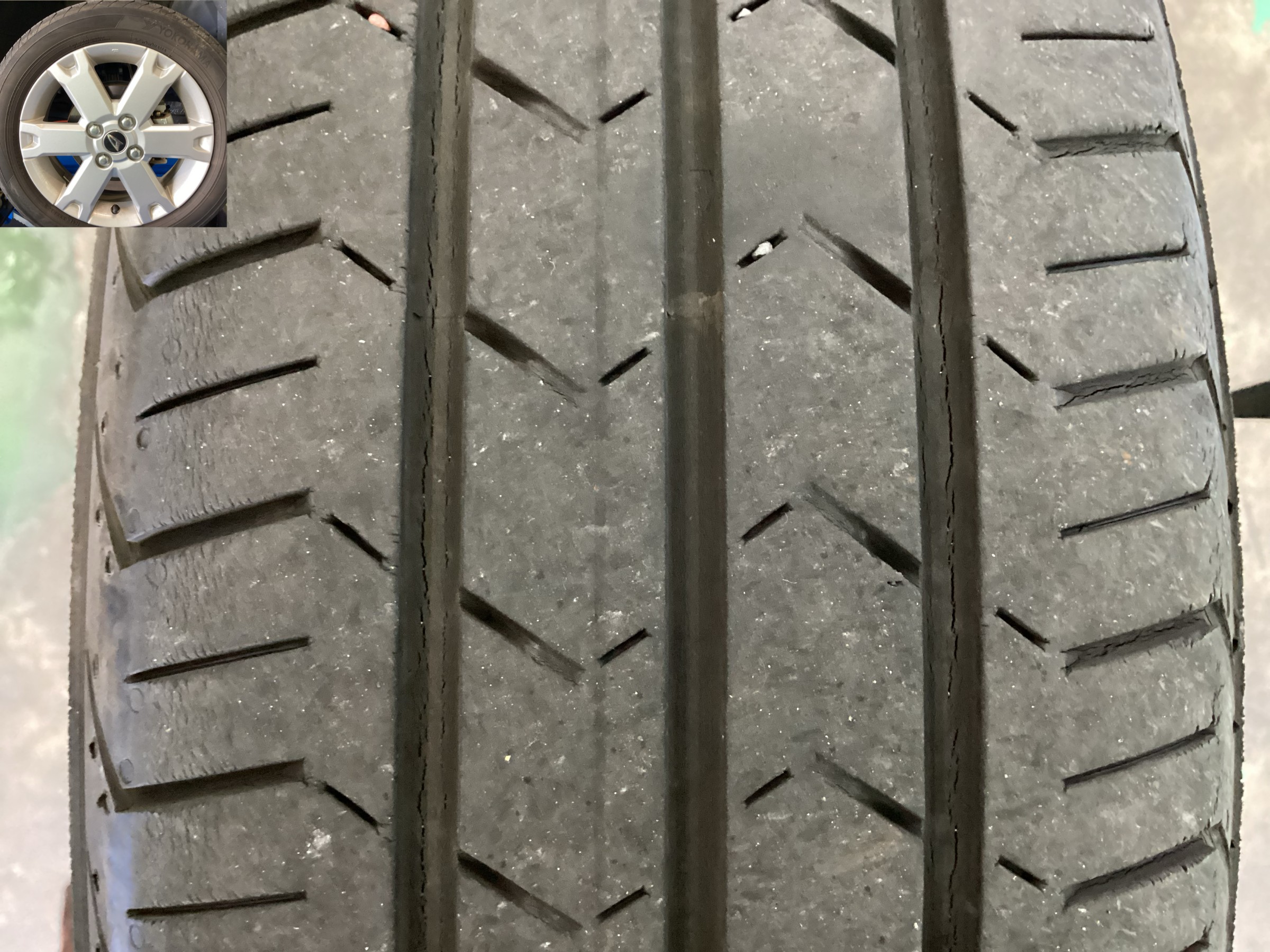 「タイヤを使い始めてから3年ほど経つので、点検してひび割れや溝が少なくなっていないか見てほしい」とのことでご来店されました。早速点検させていただくと、タイヤの溝はまだ十分残っていましたが、タイヤのサイド部分(側面)にひび割れが発生していました。