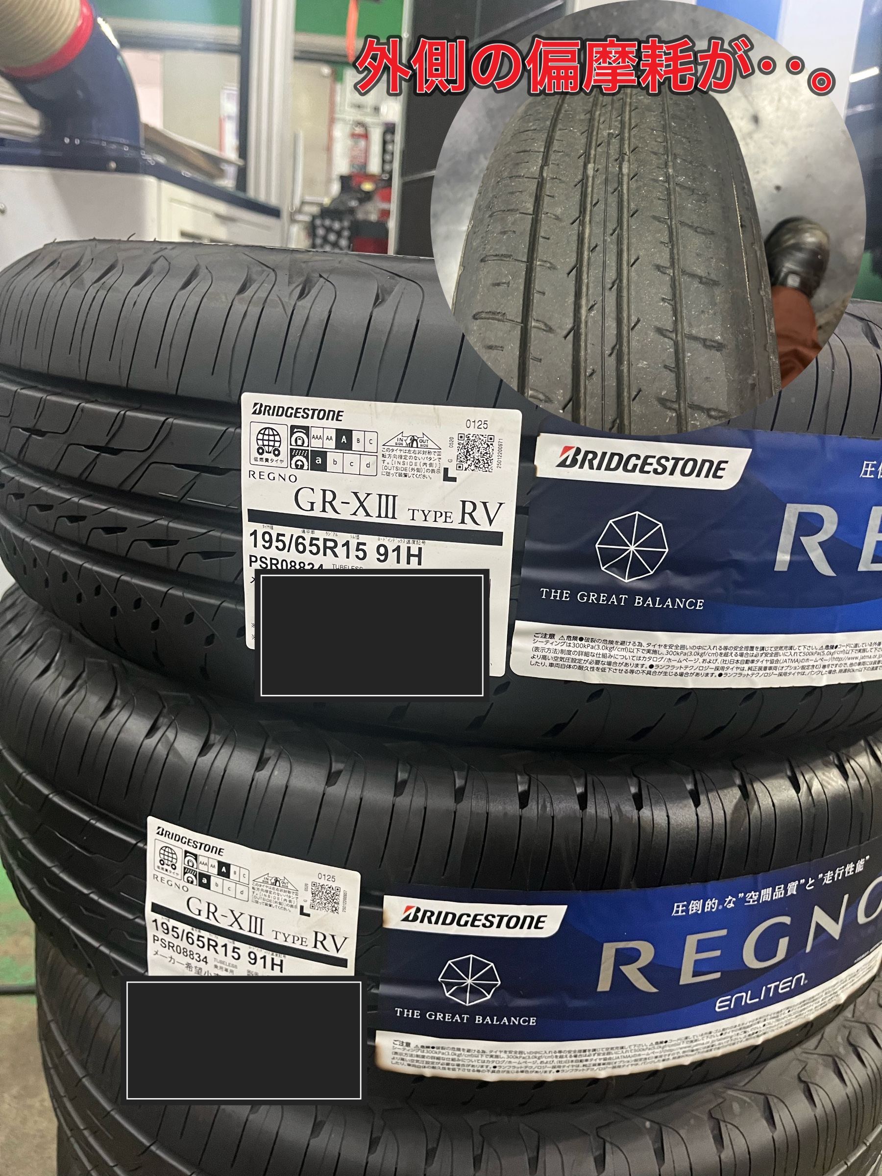 ご家族4人でお出かけの機会が多いとのことで、ミニバンにピッタリなタイヤとして、ブリヂストンのプレミアムタイヤ**「レグノ GR-XⅢ type RV」**をご提案しました。