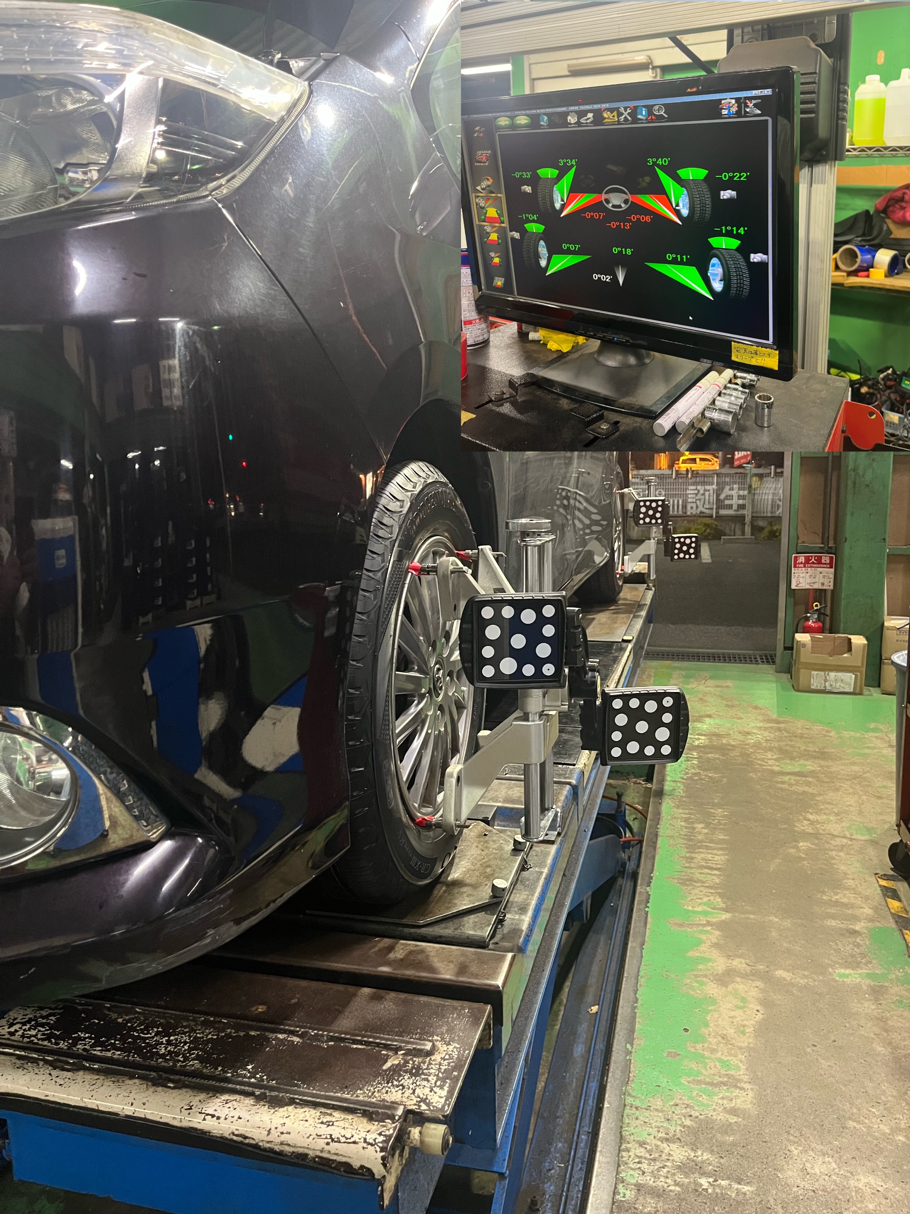 タイヤ交換と合わせて、アライメント測定・調整も実施しました。 タイヤの取り付け角度がずれていると、タイヤが偏って摩耗したり、真っ直ぐ走りにくくなったりします。タイヤ交換と同時にアライメント調整を行うことで、タイヤの性能をしっかり引き出し、長持ちさせることができます。