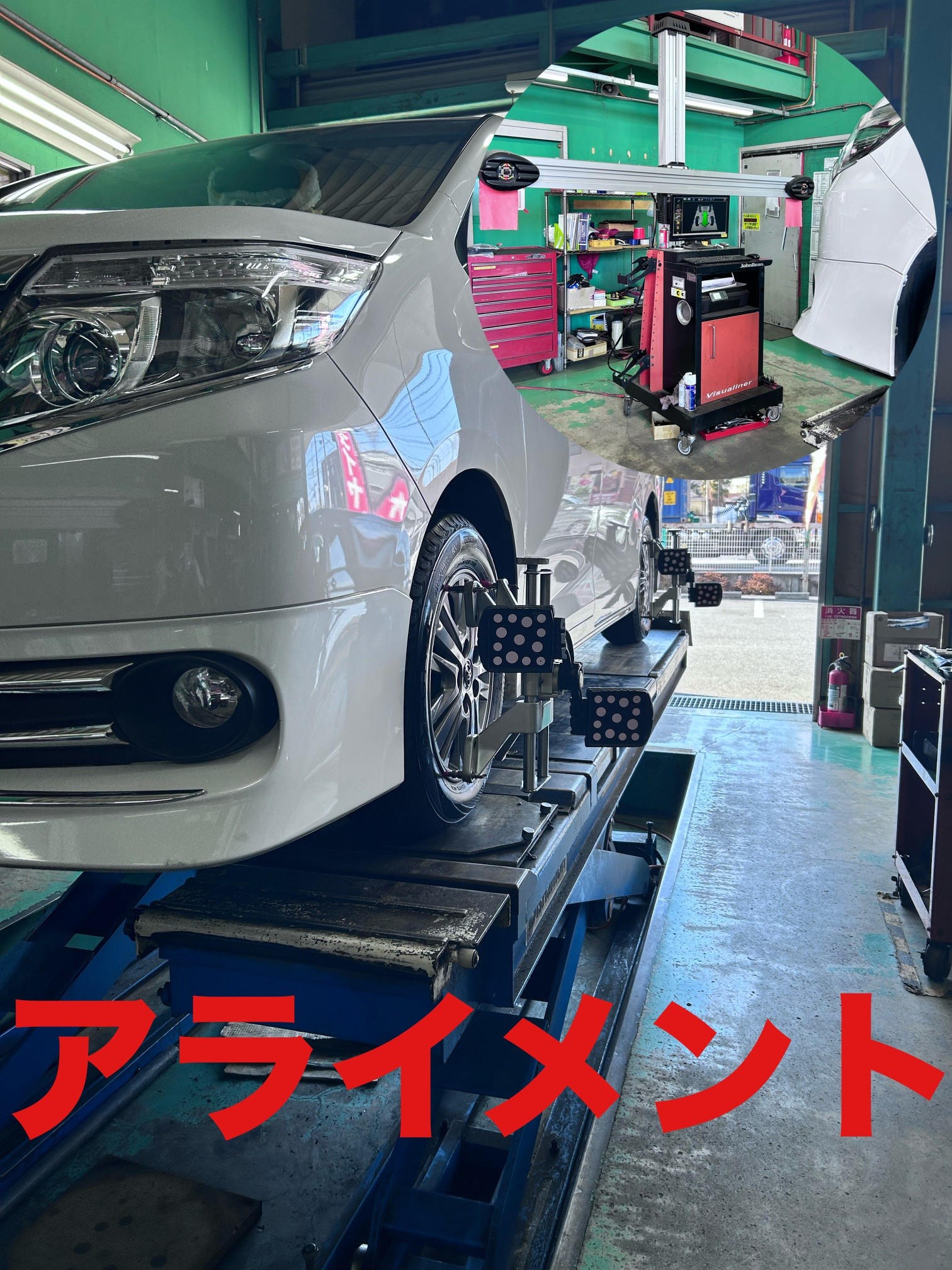 タイヤ交換後は、最新のアライメントテスターで 測定 → 必要箇所を調整。