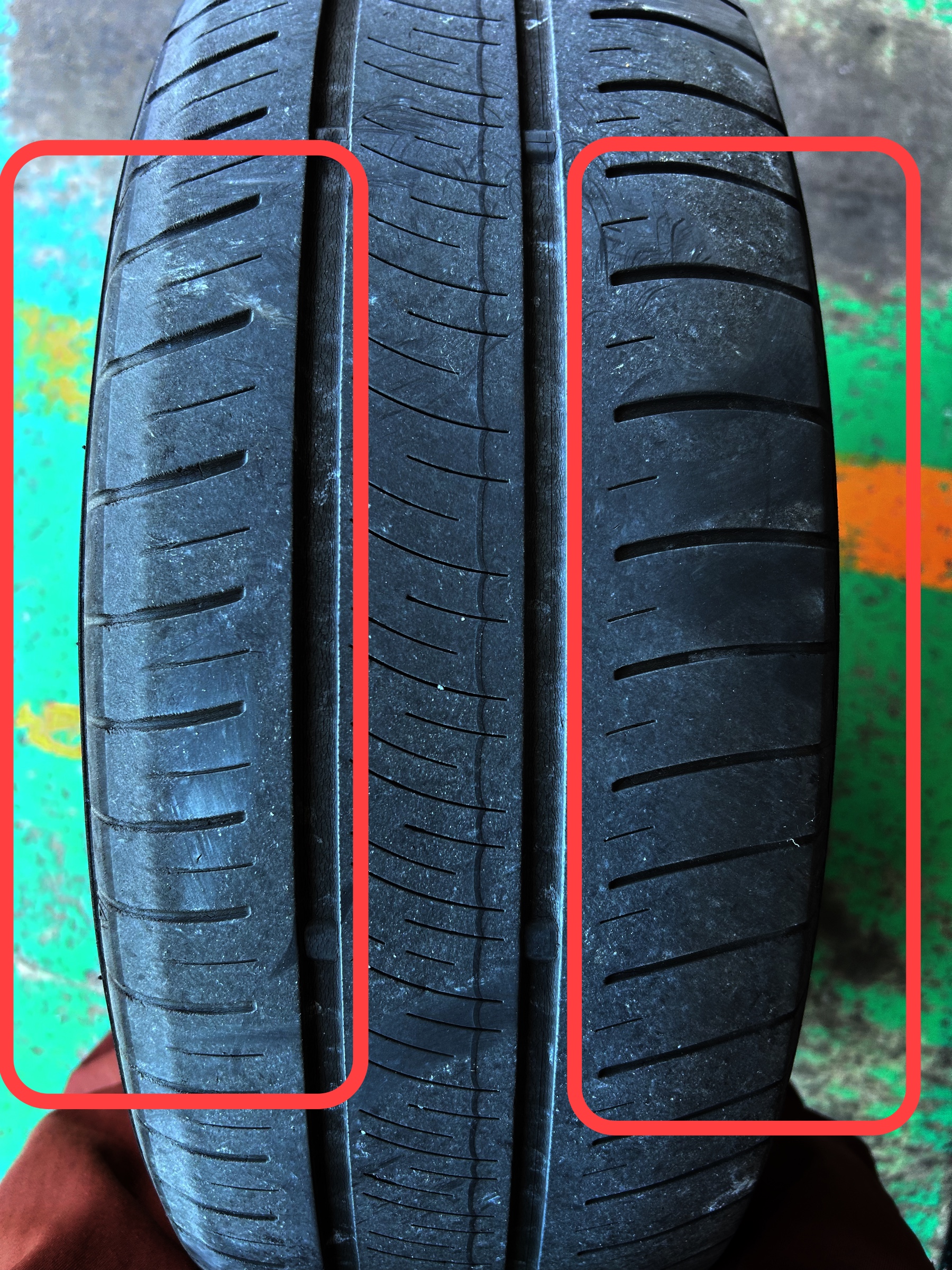 写真の赤枠部分を見ると、タイヤの溝が不自然に減っている**「偏摩耗(片減り)」**が見受けられました。