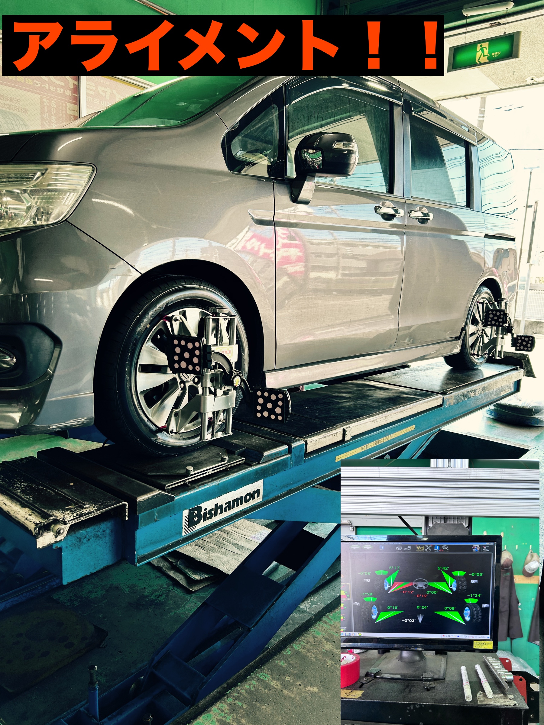 せっかくの新品タイヤを長く使っていただくため、アライメント(タイヤの取付角度)調整を実施!